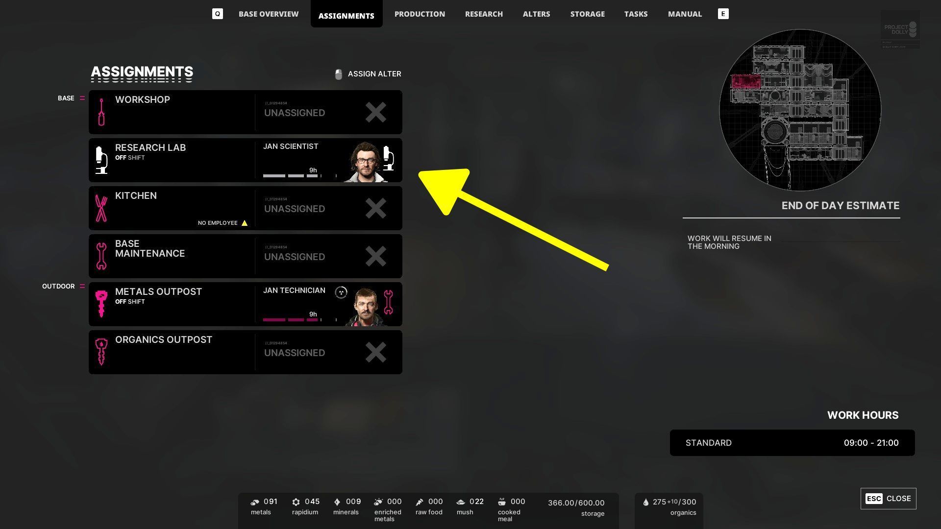 - Dodatkowo musicie przejść do zakładki Przydzielone zadania i ustawić Jana naukowca do pracy w laboratorium (przykład na obrazku). Będzie ją wykonywał w ciągu dnia, a po skończeniu każdego projektu badawczego otrzymacie powiadomienie.