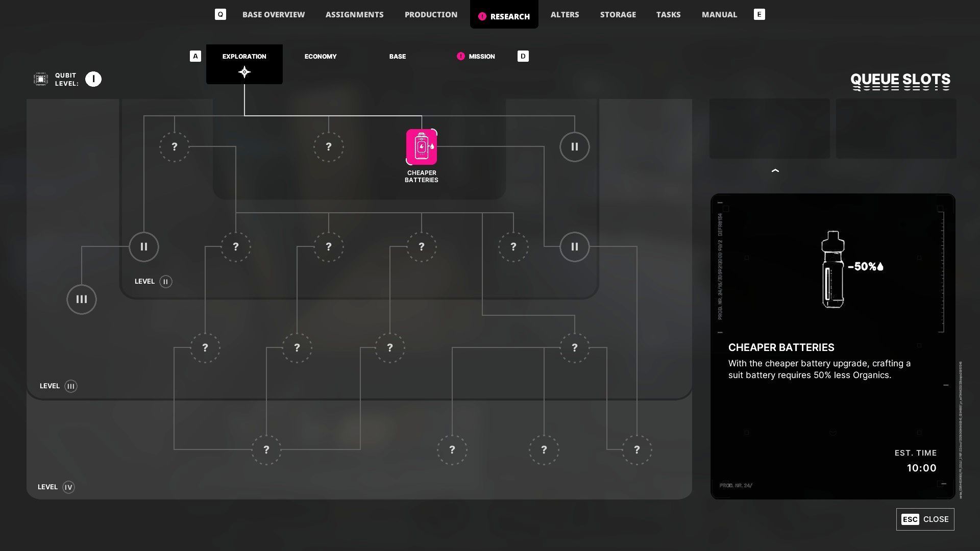 - Wyprodukowanie 1 baterii domyślnie kosztuje 40 substancji organicznych, ale możecie opracować projekt badawczy Tańsze baterie - jest on dostępny już od 1 poziomu laboratorium badawczego i obniża koszt produkcji baterii o 50%.