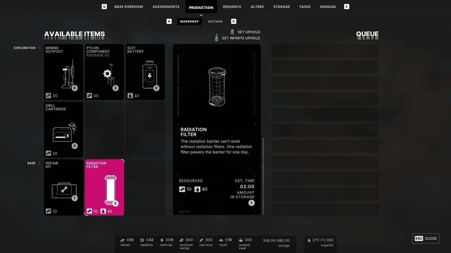 - Kolejnym utrudnieniem jest to, że bariera radiacyjna do działania potrzebuje filtrów radiacyjnych. Musicie je produkować w warsztacie (10 metali, 40 substancji organicznych), przy czym sam proces możecie zautomatyzować, tzn. bariera radiacyjna może pobierać kolejne filtry z magazynu bez Waszego udziału.