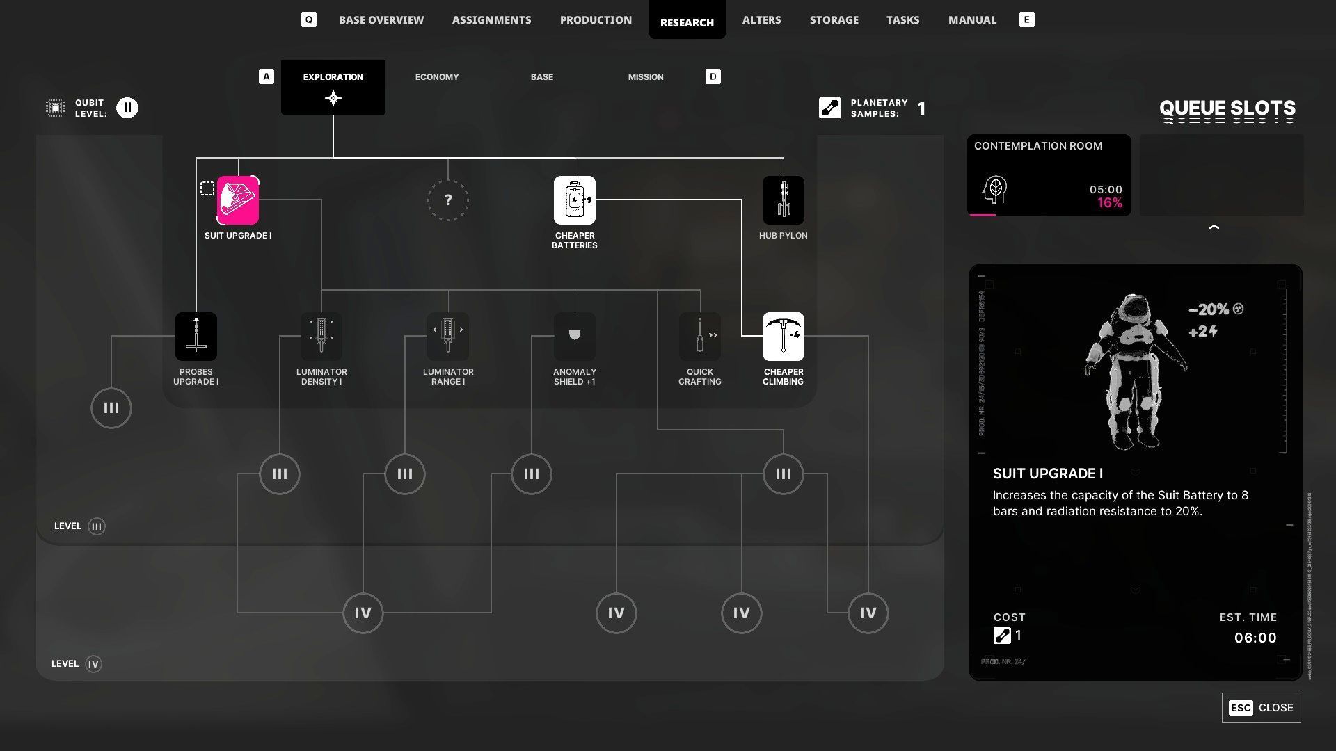 - Ulepszenie kombinezonu to technologie powiązane ze strojem Jana. Każdy ukończony taki projekt może zwiększyć wytrzymałość kombinezonu na promieniowanie, by wolniej ono narastało. Niestety do ukończenia badań są potrzebne unikalne próbki planetarne.