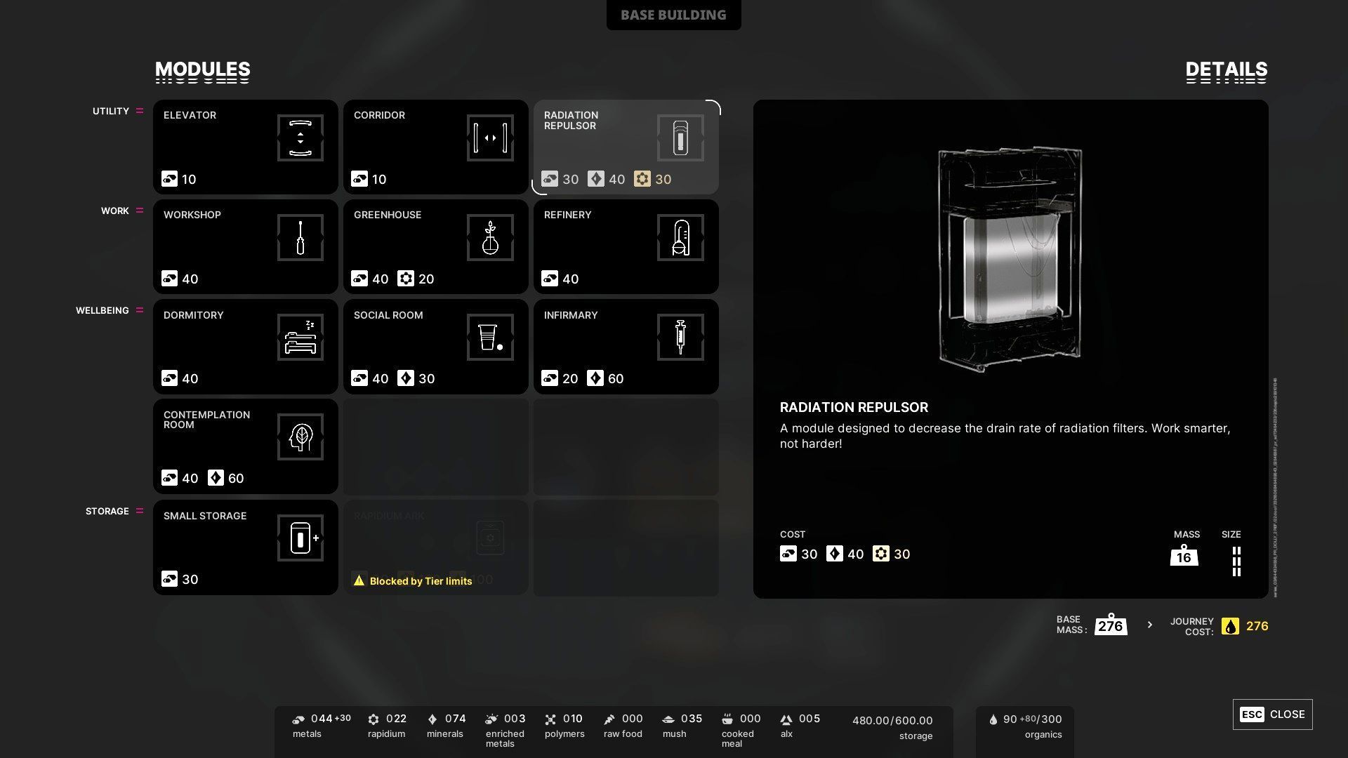 - Po wynalezieniu technologii możecie konstruować repulsory w bazie - każdy z nich wymaga zużycia 30 metali, 40 minerałów i 30 rapidium. Mogą one zwiększać skuteczność filtrów radiacyjnych. Mając kilka takich obiektów możecie docelowo wyeliminować konieczność produkcji i wymiany filtrów.