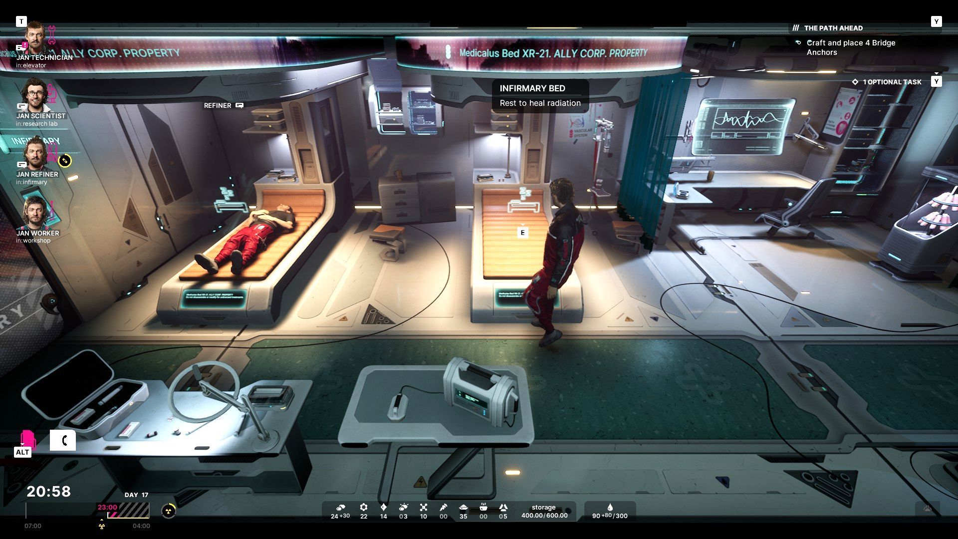 - Możecie korzystać z łóżek w ambulatorium, by przyśpieszyć proces usuwania skutków promieniowania. Wadą tej metody jest to, że kolejny dzień w grze rozpoczniecie nieco później. Polecamy używać tej techniki jeśli poziom promieniowania osiągnął niebezpiecznie wysoki poziom.