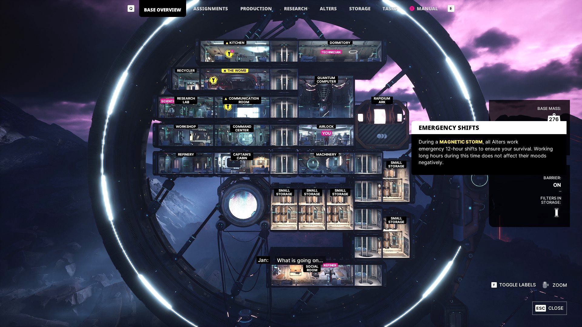 - Jan i jego alterzy powinni pozostawać w bazie do zakończenia burzy. Nie oznacza to jednak, że muszą pozostawać bezczynni. Wszystkie postacie mogą spokojnie pracować na terenie bazy, a dzienny czas pracy może zostać wydłużony do 12 godzin.