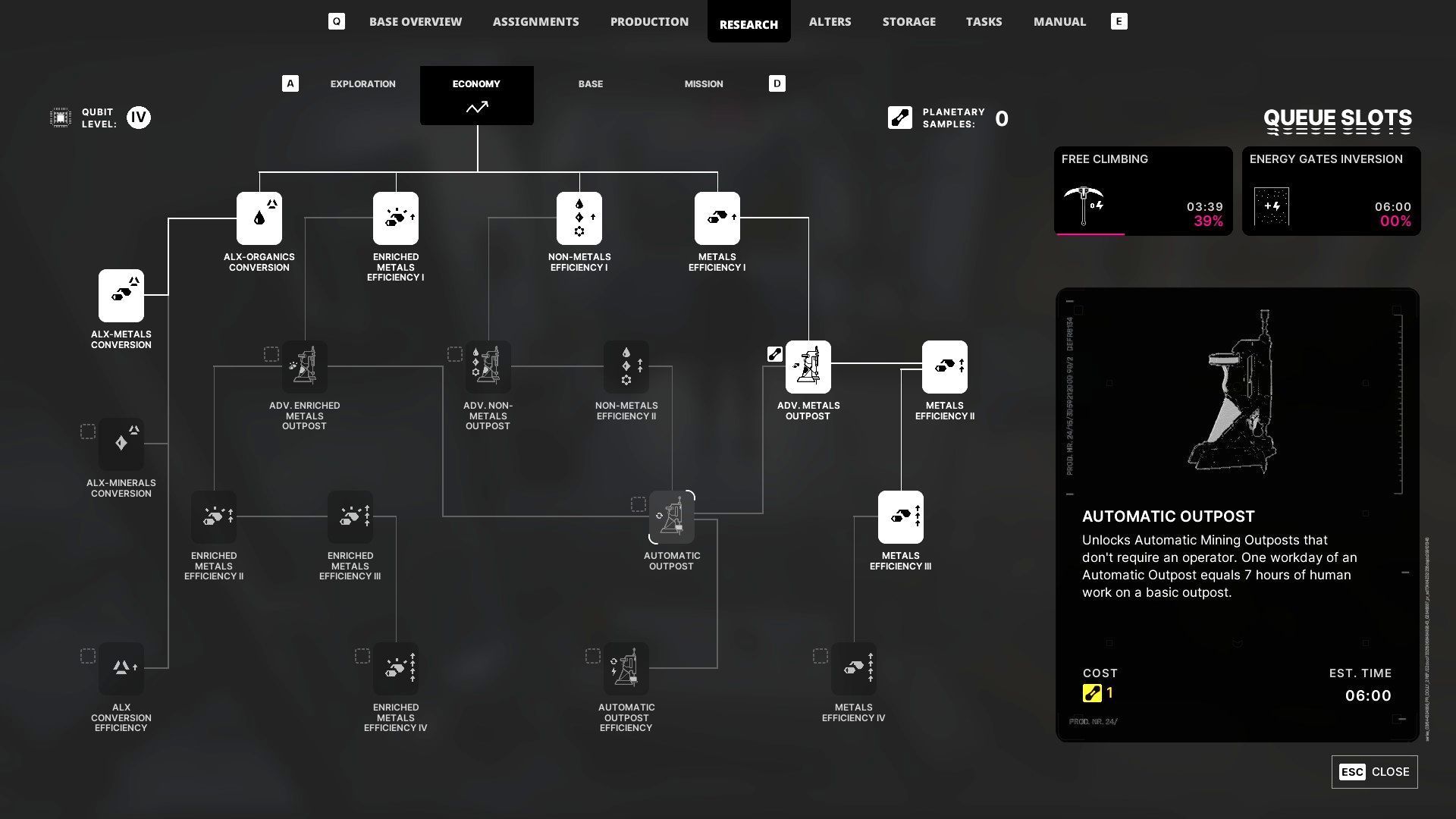 - Jeszcze później możecie odblokować i opracować projekt badawczy Automatyczny punkt wydobywczy. Po skonstruowaniu punkty wydobywcze mogą działać bez potrzeby pracowników i autonomicznie wydobywać surowce w godzinach dziennych.