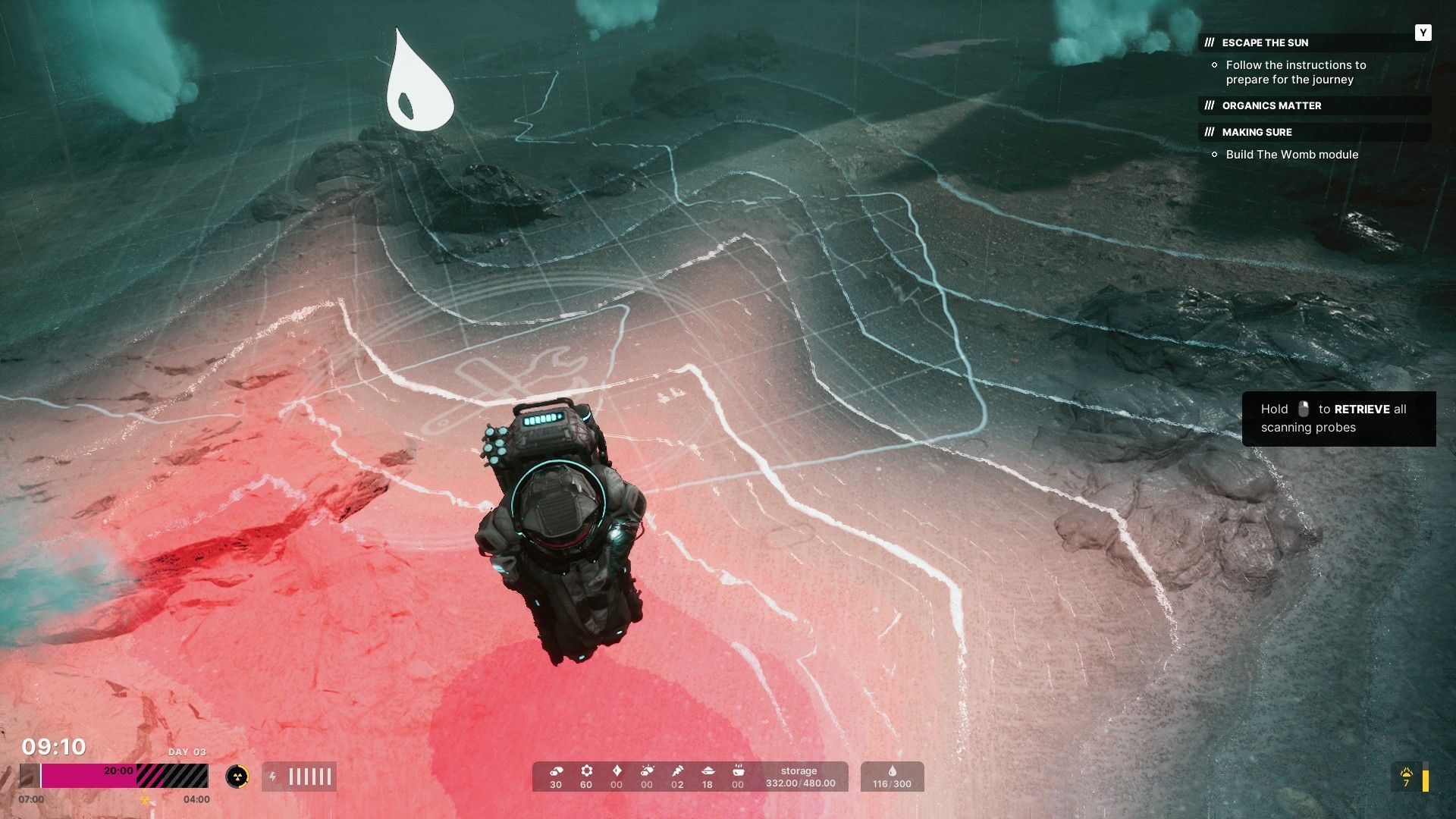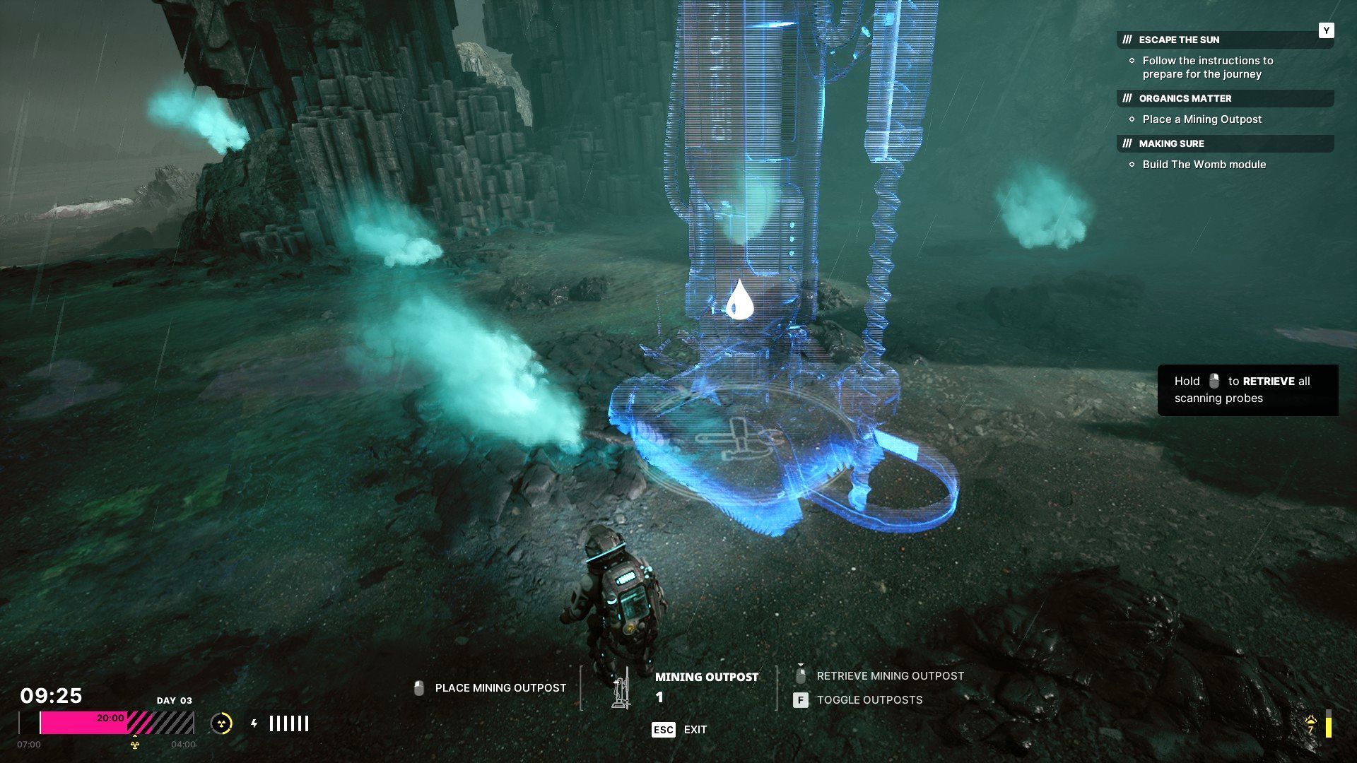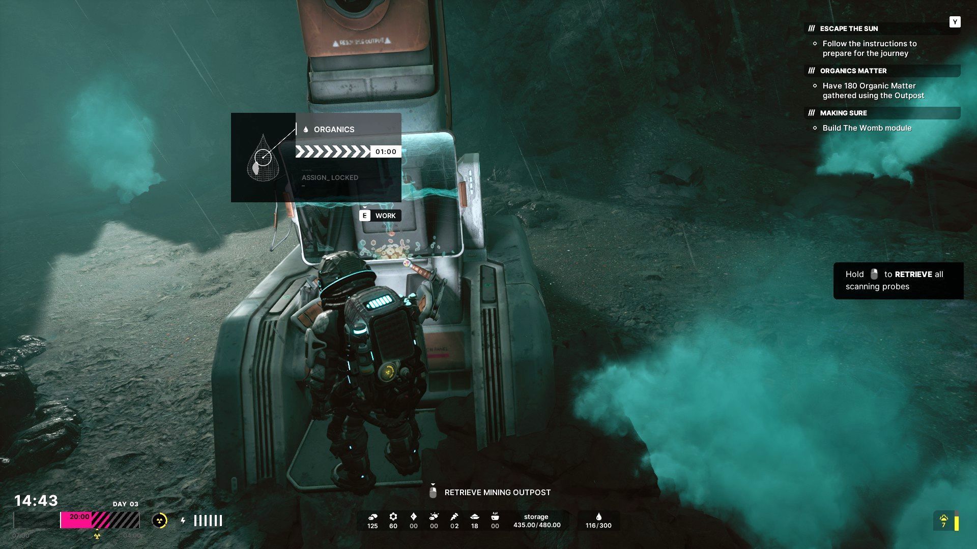 - Dzięki sfinalizowaniu połączenia możecie już używać punktu wydobywczego (nie działa on w sposób zautomatyzowany). Po tym jak do niego powrócicie wejdźcie w interakcję z terminalem żeby rozpocząć pozyskiwanie substancji organicznych. Spowoduje to przyśpieszenie upływu czasu.