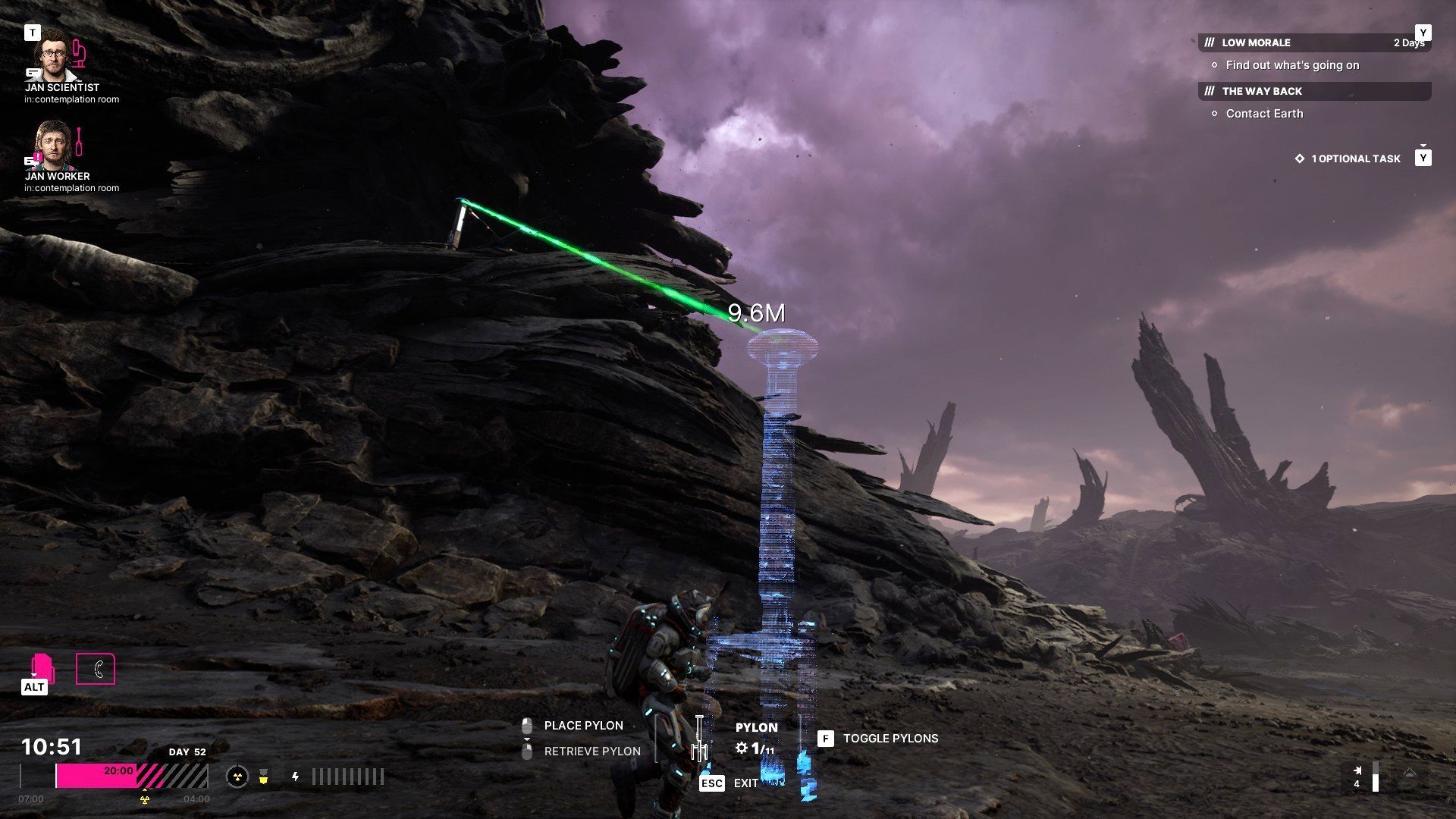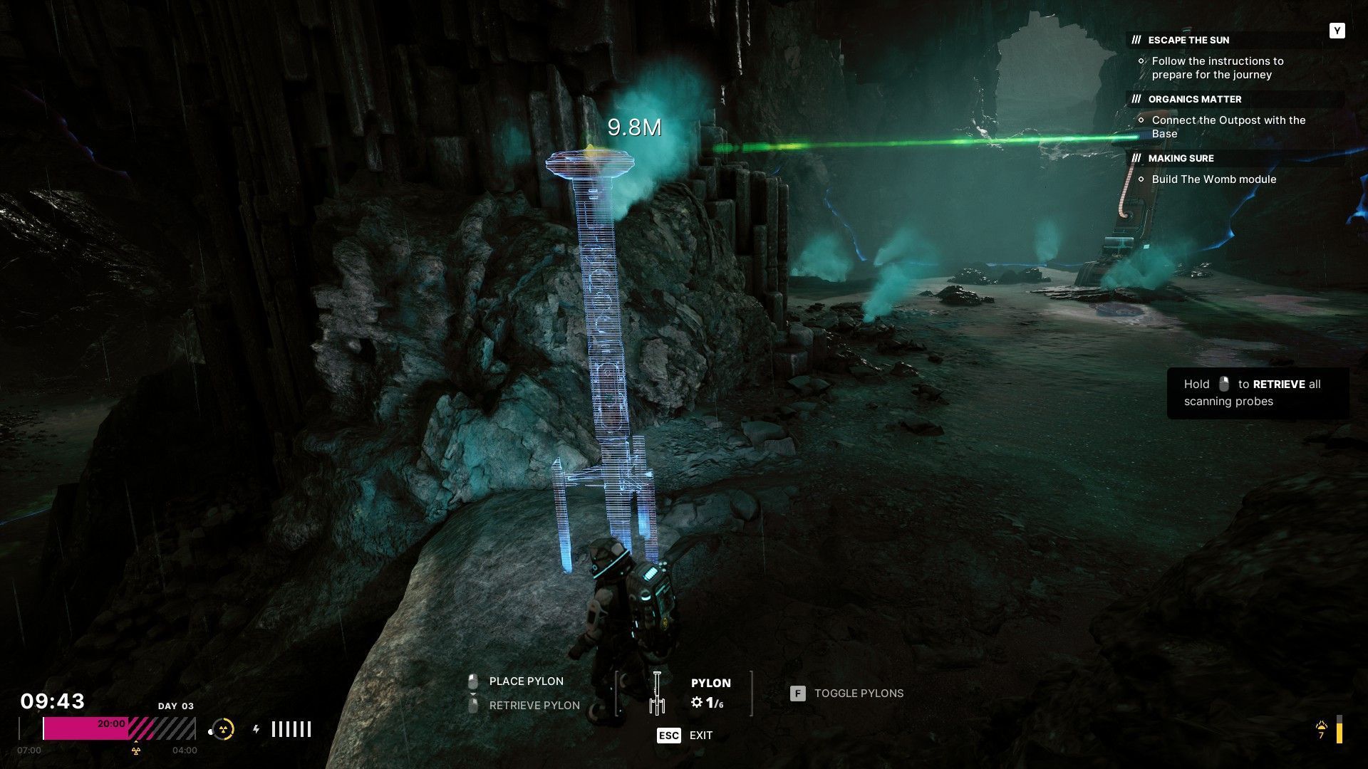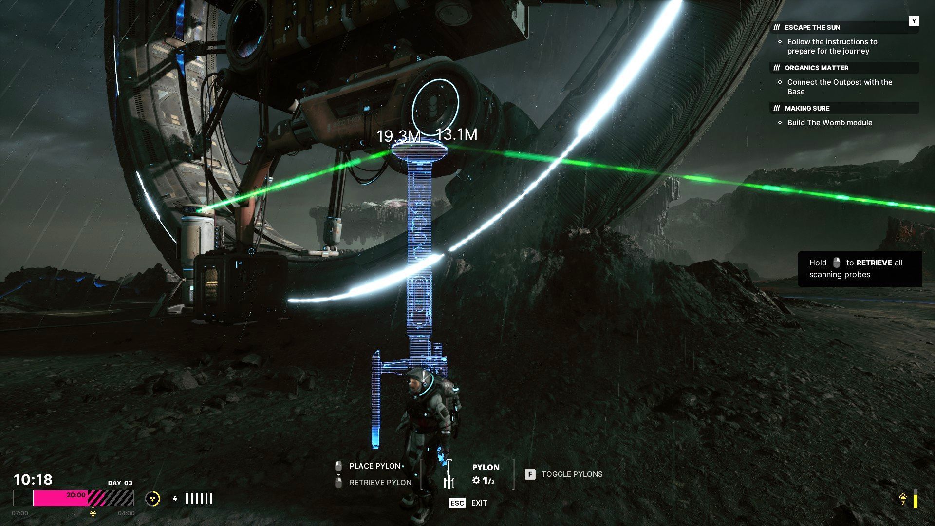 - Ostatni pylon powinien połączyć Waszą bazę z wybudowanym punktem wydobywczym. Zielone linie informują o prawidłowych połączeniach. W razie potrzeby przesuńcie się w inne miejsce, bo połączenie mogą blokować np. skały.