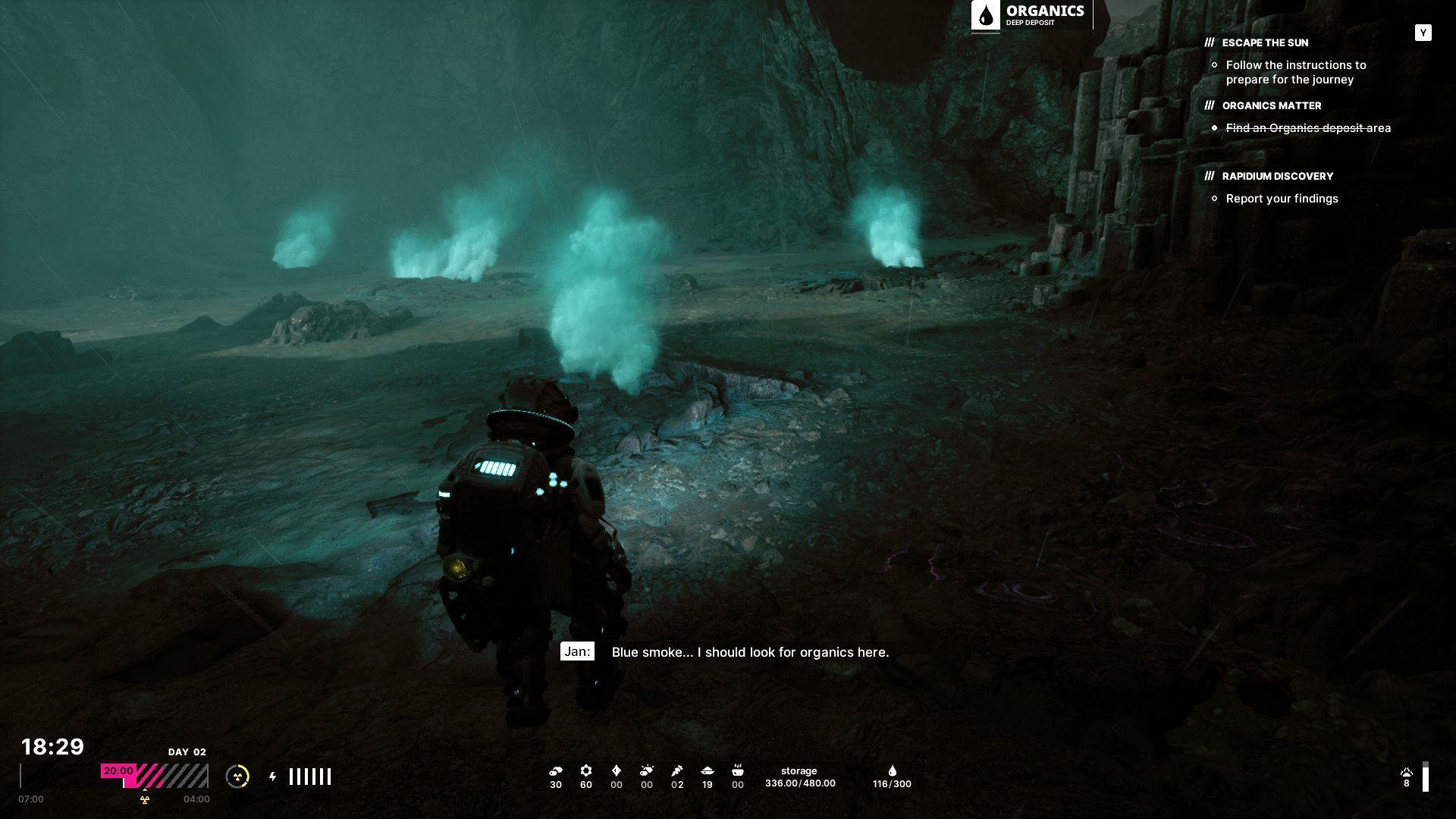 - Wyruszcie poza bazę i zacznijcie badać najbliższą okolicę. Złoże substancji organicznych możecie rozpoznać po niebieskim dymie oraz ikonie kropli. W naszym przypadku dostęp do niego blokowała ściana wspinaczkowa.