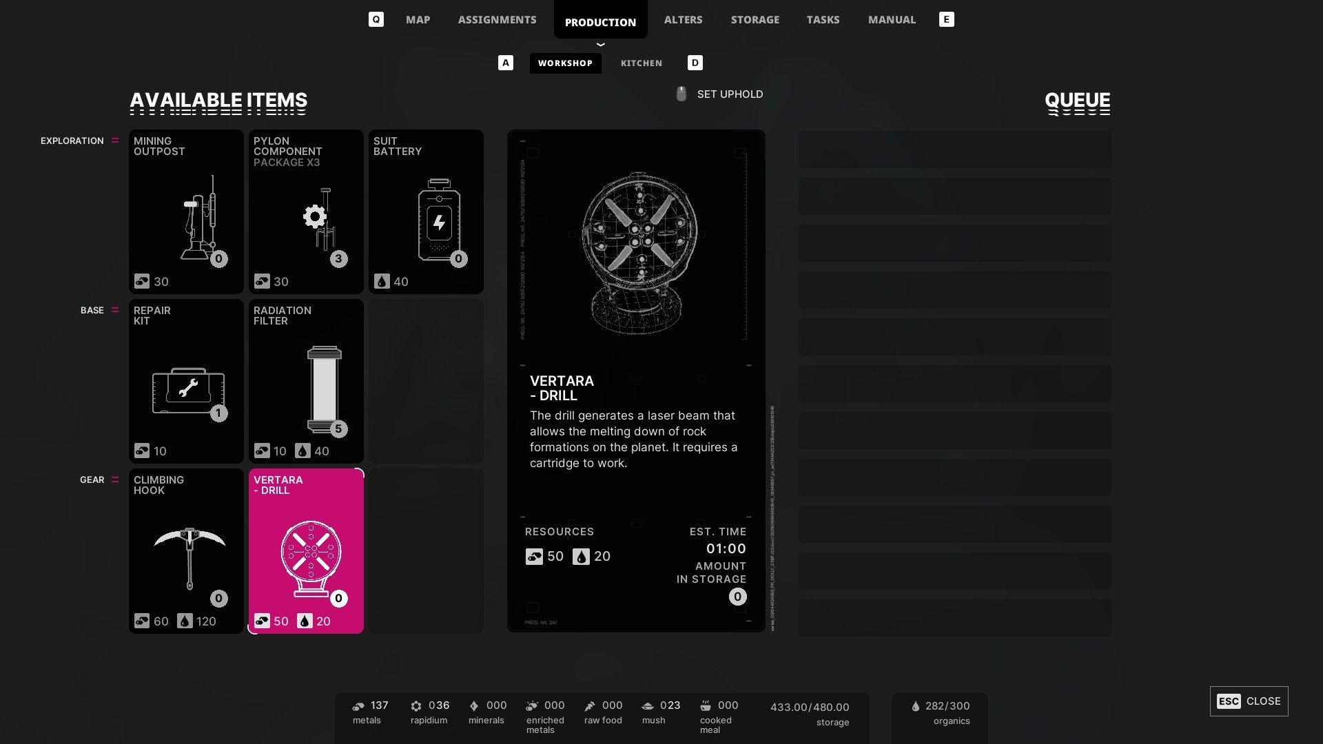 - Z pierwszą blokadą skalną powiązane jest główne zadanie Znajdź wyjście z sytuacji. Musicie powrócić do bazy i skierować się do warsztatu. Trzeba wyprodukować wiertło Vertara - potrzeba na to 50 metali i 20 substancji organicznych.