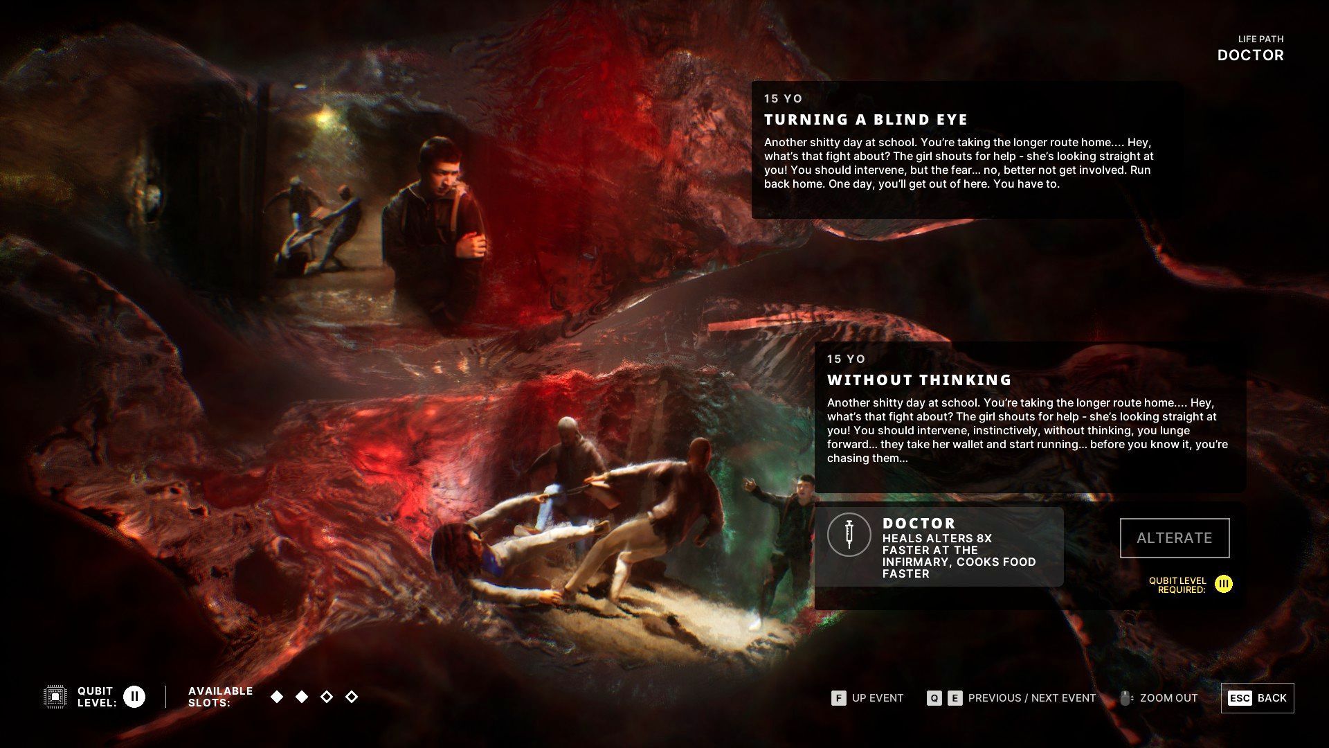 - Odblokowanie dostępu do nowych alterów - Podczas przeglądania alterów na ścieżkach życia możecie dowiadywać się o wymaganiach do ich stworzenia. W przykładzie z obrazka Jan doktor stanie się dostępny po odblokowaniu 3 poziomu kubitów.