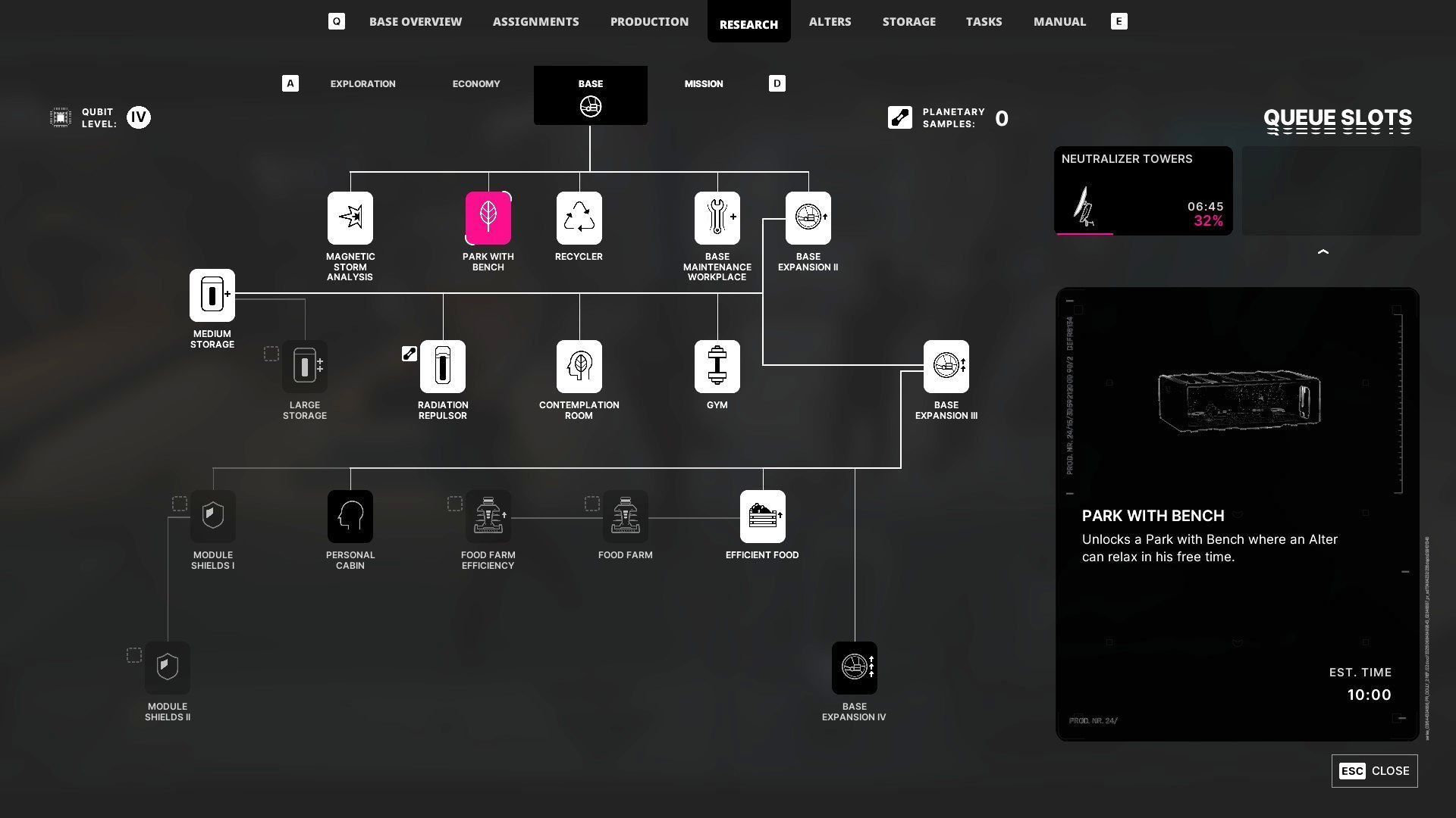 - Po zakończeniu badań możecie zbudować mini-park w bazie. Jego postawienie kosztuje 40 metali i 60 minerałów. Musicie mieć dodatkowo 5 wolnych slotów (jedna linia w poziomie).