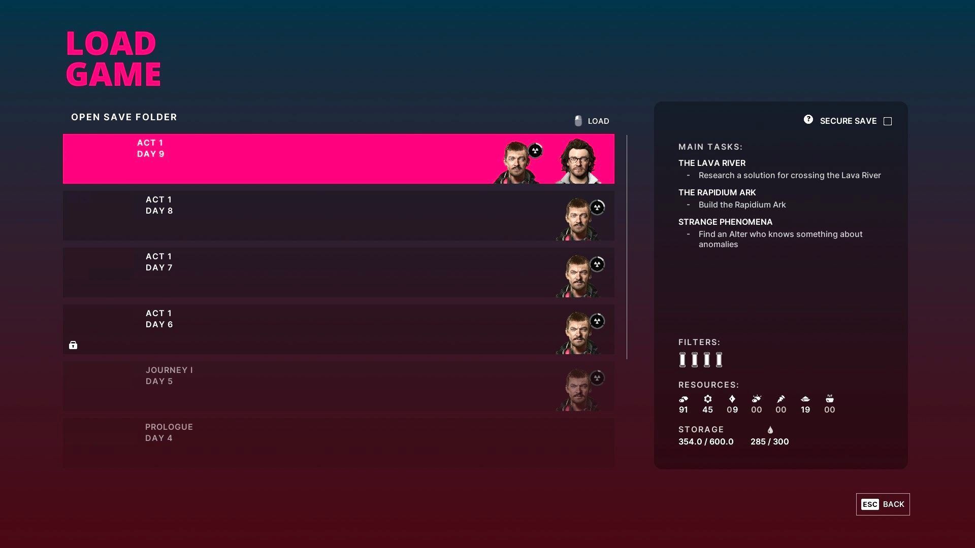 - W razie potrzeby wczytujcie zapis z początku dnia żeby w inny sposób go rozegrać i uniknąć tych samych problemów lub przygotować się lepiej na ewentualne kłopoty. Możecie też wybierać sejwy z poprzednich dni i powtórzyć dzięki temu większy fragment gry. W oknie zapisów możecie je przeglądać i odczytywać informacje m.in. o aktualnym dniu, stanie bazy, zadaniach czy alterach obecnych w bazie.