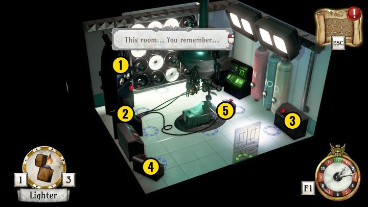 Znajdziesz się w sali widocznej na powyższym obrazku. Aby uruchomić przewody musisz nacisnąć widoczne na obrazku guziki w odpowiedniej kolejności, którą oznaczono na obrazku. Jeśli naciśniesz niewłaściwy guzik, to ustawienie zostanie zresetowane i będziesz musiał zacząć od początku. Po wszystkim zrestartuj dzień.