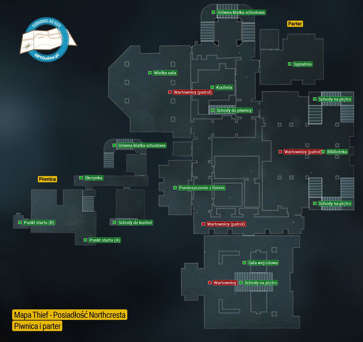 Powyższa mapa prezentuje dwa spośród czterech poziomów posiadłości Barona Northcresta, a mianowicie piwnicę oraz parter. Gorąco polecam zbadać wszystkie piętra budynku, a to dlatego, że z oczywistych względów do odnalezienia jest cała masa mniej lub bardziej wartościowych przedmiotów. Opis poszczególnych pięter willi oraz informacje na temat dotarcia do gabinetu Barona zamieszczone zostały na pozostałych stronach tego rozdziału.