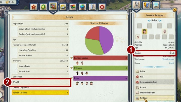 Domy dla bogatszych zacznij stawiać w momencie, gdy w twoim mieście pojawią się osoby o wyższym statusie majątkowym jak np. lekarze. Majętność mieszkańców możesz sprawdzić na dwa sposoby. Pierwszym z nich jest klikanie na konkretnego mieszkańca. W panelu z podstawowymi informacjami, będzie określona jego majętność [1]. Drugim sposobem jest sprawdzenie w zakładce ludzie w almanach. Wśród możliwych do wyboru opcji uporządkowania mieszkańców Tropico, znajdziesz także ich sytuację finansową [2]. Po kliknięciu w tą zakładkę zobaczysz podzieloną ze względu na ilość posiadanych pieniędzy listę obywateli.