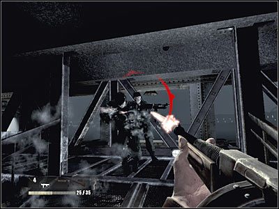 Nie przejmuj się, gdyż w najbliższej okolicy nie znajdują się żadni przeciwnicy. Nie musisz więc korzystać z posiadanej broni. Ruszaj przed siebie. Ze schodów nie możesz niestety skorzystać. W rezultacie musisz skierować się do przedstawionej na screenie drabiny.