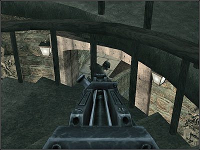 Możesz już skierować się w stronę pojedynczych drzwi. Przygotuj karabin, a następnie skieruj się do nowego pomieszczenia. Zabij widocznych na wprost wrogów. Bardziej powinieneś się jednak obawiać gostków okupujących lewy balkonik (screen). Eliminuj ich pojedynczo, za każdym razem ostrożnie się wychylając. Na szczęście na dole nikogo nie będzie.