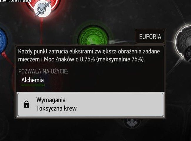 11) Euforia (Euphoria) - Mutacja ta zwiększa obrażenia zadawane mieczem i moc znaków o 0.75% za każdy punkt zatrucia eliksirami. Maksymalna premia jaką możesz w ten sposób uzyskać to 75 procent.