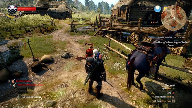 Ciebie interesuje kartka, którą znajdziesz na wozie na lewo od budynku. Po jej przeczytaniu poznasz kolejny punkt, do którego musisz zmierzać. Na miejscu zastaniesz dwóch żołnierzy, najpierw wybierz pierwszą opcję dialogową, która umożliwi kolejne wybory: możesz ich przekupić (1000 koron), walczyć z nimi (dwójka przeciwników na 32 poziomie, jeden z nich będzie miał przy sobie klucz) lub użyć znaku Axii, jeśli masz go wystarczająco ulepszonego. Tak, czy inaczej będziesz mógł teraz dostać się do kryjówki. Warto jednak rozważyć ich zabicie od razu, gdyż w przeciwnym razie przy wyjściu z kryjówki i tak będziesz musiał ich zabić. Przed kolejną walką zdecydowanie warto nałożyć olej na miecz stalowy.
