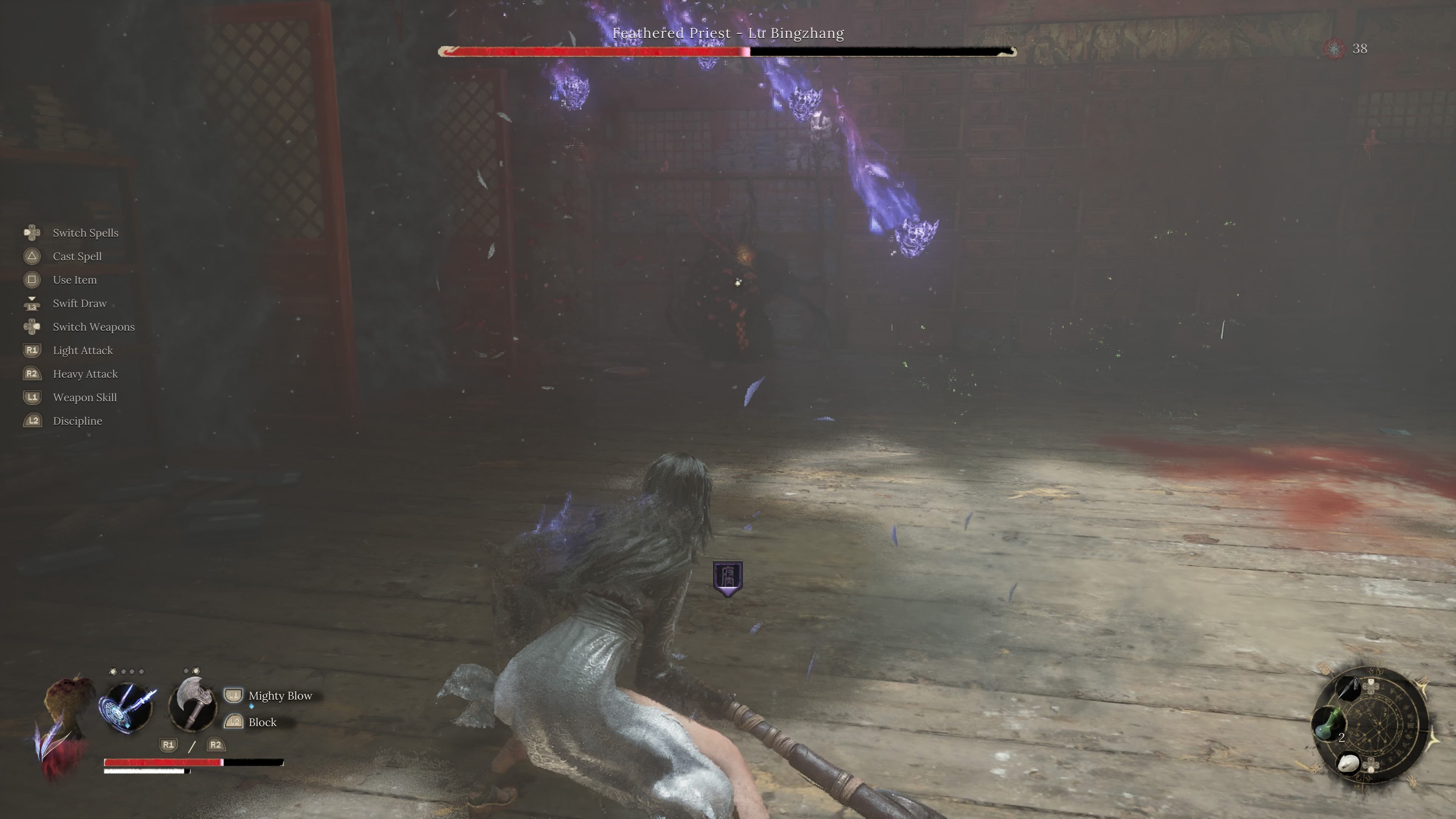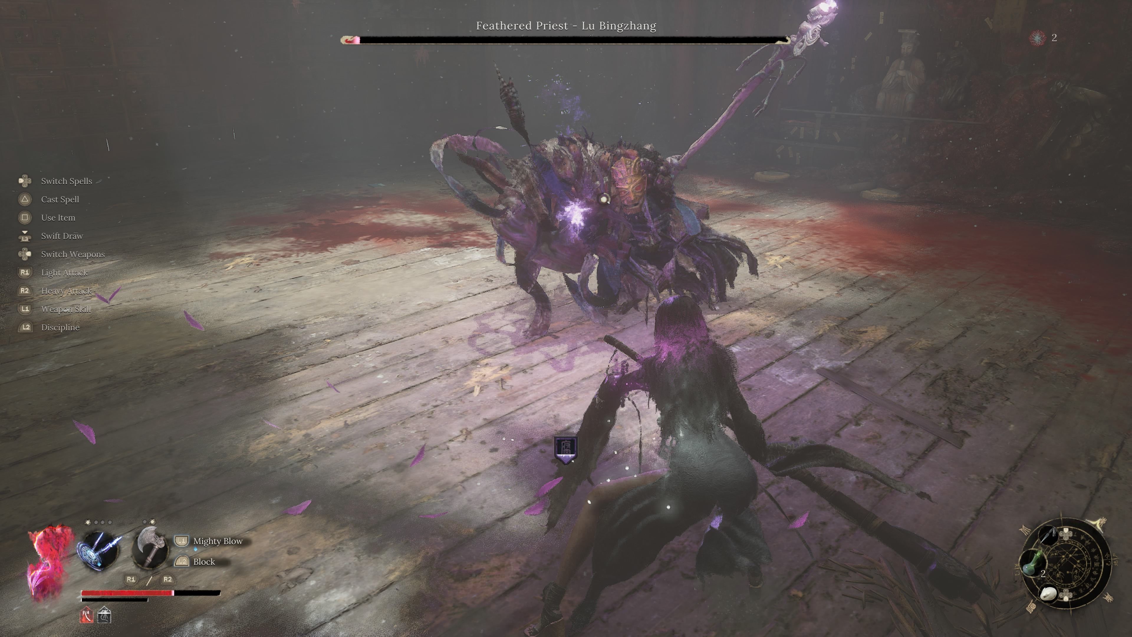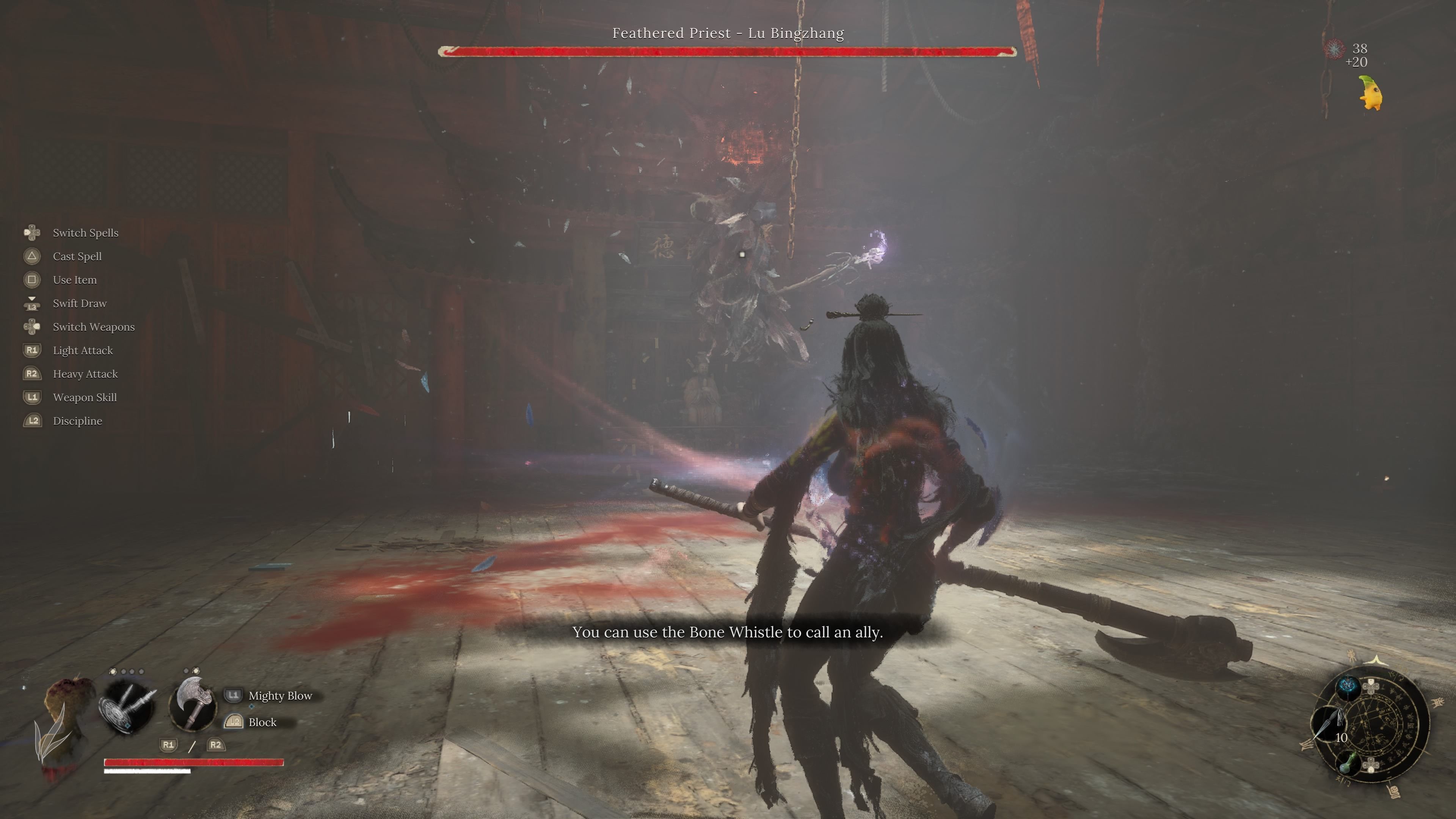 - Feathered Priest dobrze sygnalizuje swoje ataki. Często unik należy wykonać w momencie, gdy coś zaczyna się świecić, np. jego czerwony pocisk, bądź tworzy się potężniejszy ogień na jego broni.