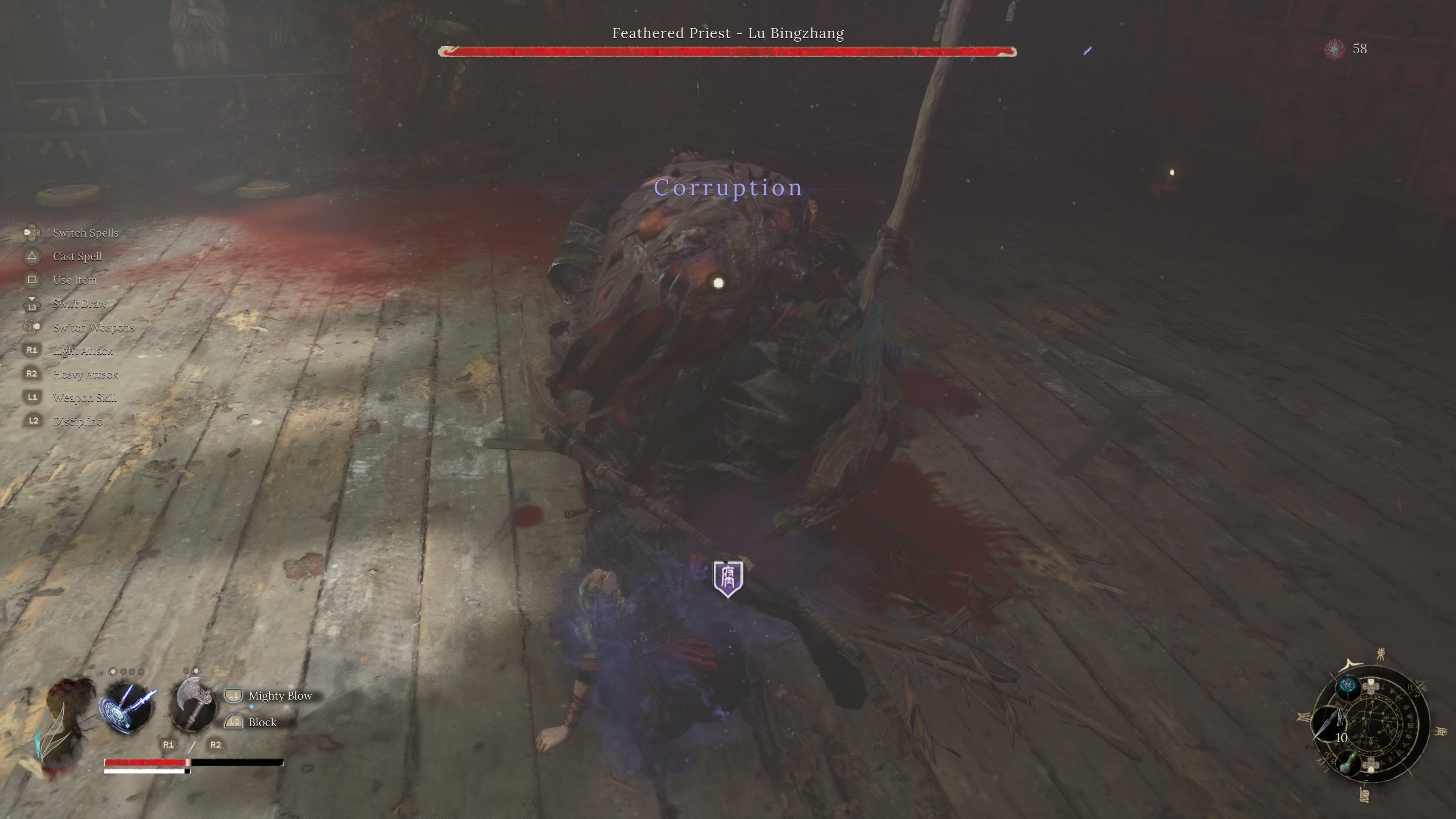 - Chwyt - prawa ręka Feathered Priest zacznie się świecić na fioletowo. W tym samym momencie boss szybko skróci dystans do Was, lecąc w linii prostej. Gdy dacie się złapać, nie dość, że otrzymacie obrażenia, to również status Corruption znacząco wzrośnie.