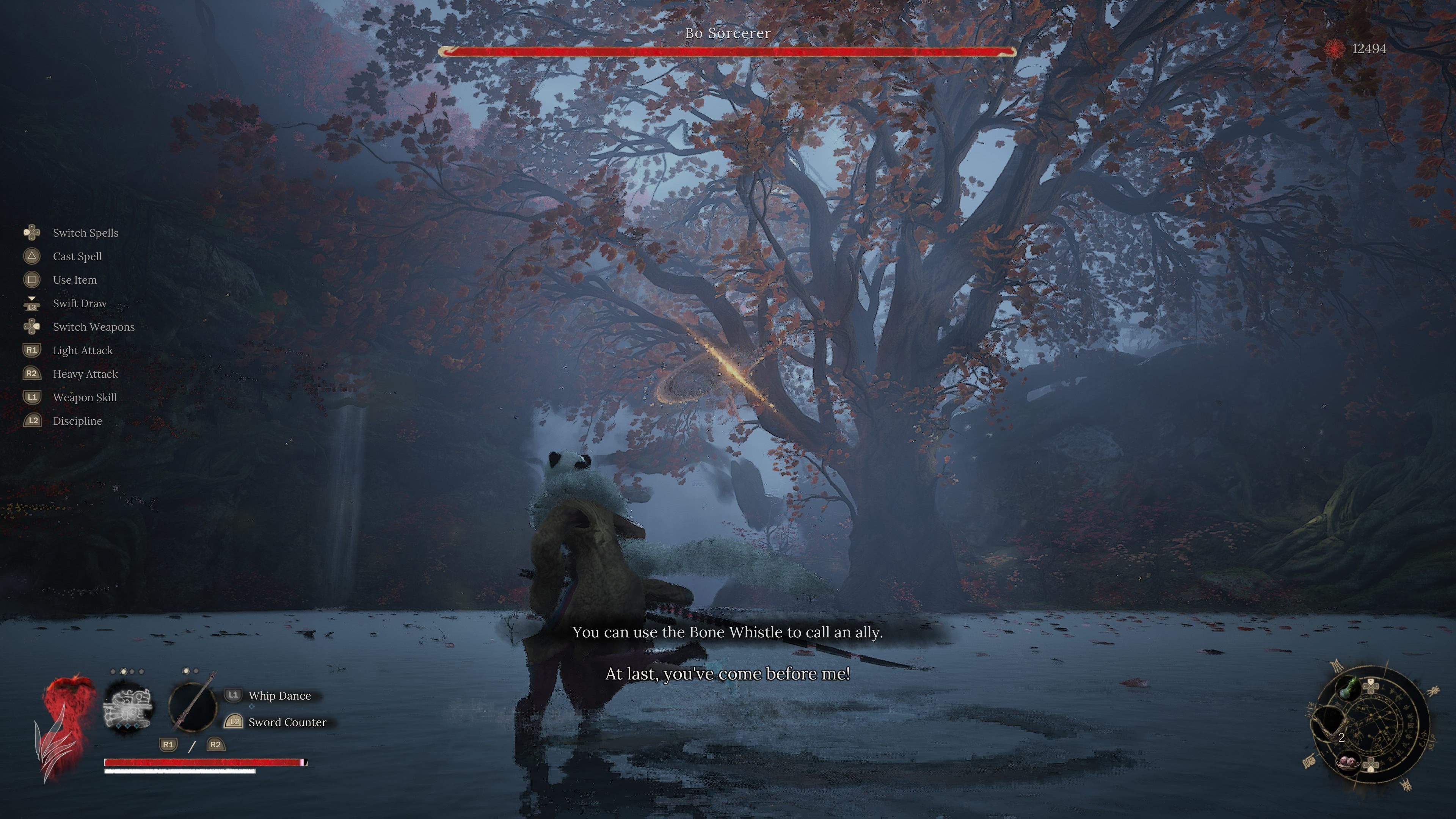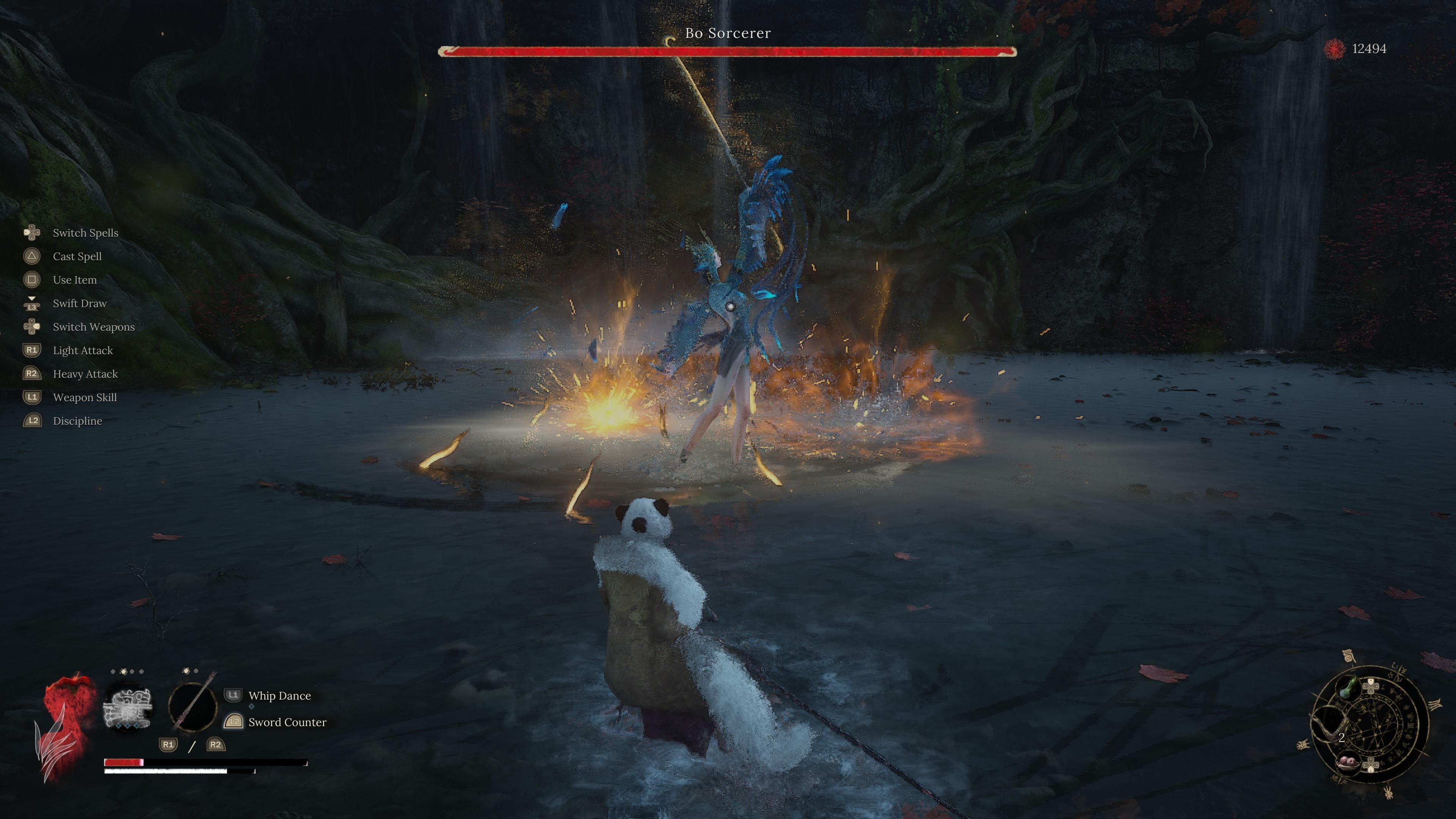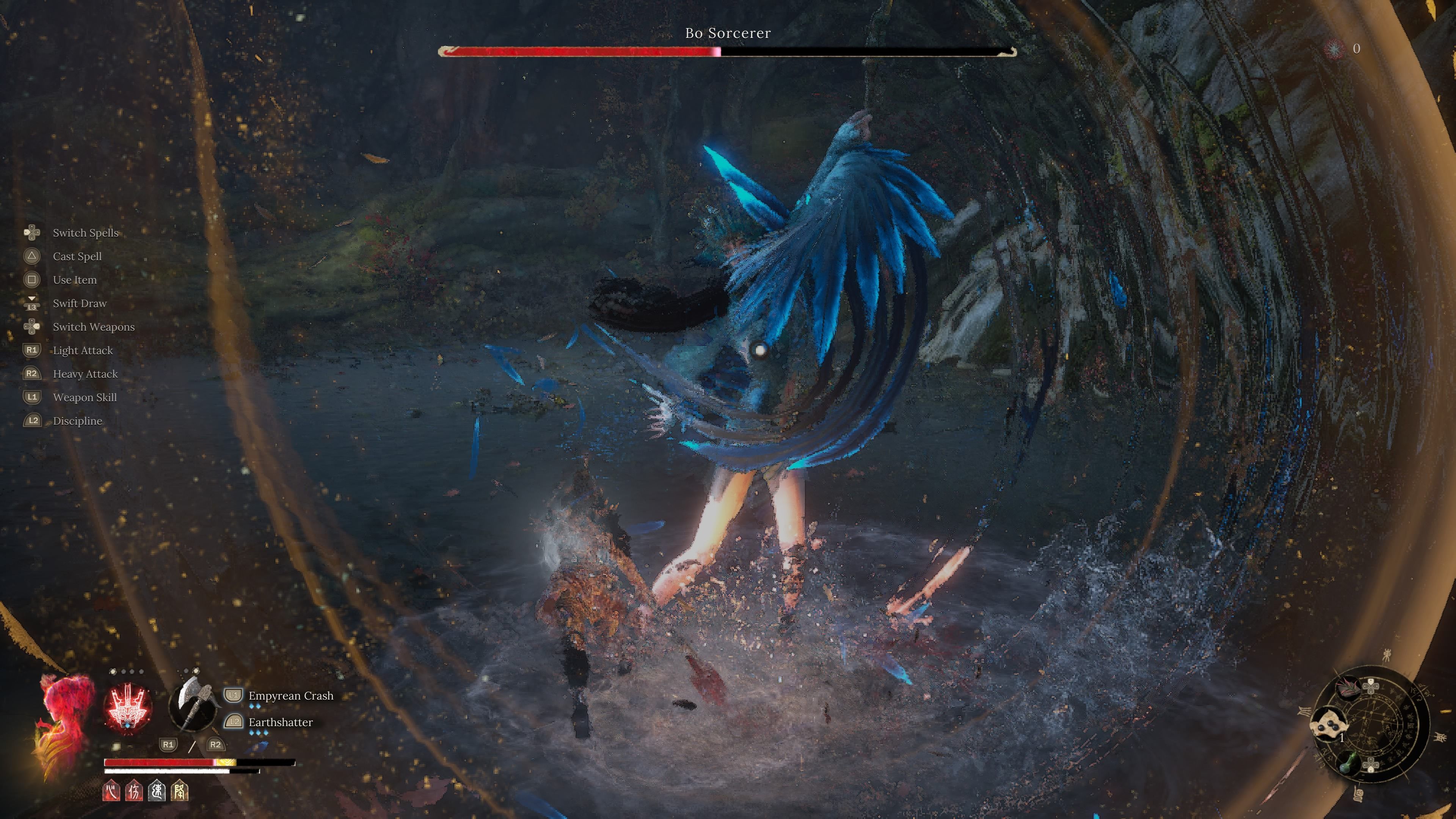 Gdy Bo Sorcerer wykonuje swój atak piórami, czym prędzej się od niej odsuńcie. Natomiast gdy ląduje, od razu po uniku bądźcie przygotowani na ładowany cios. Zadany w plecy lub od boku powinien ją ogłuszyć, a wy skorzystacie z ataku Obliterate. Po nim, wykonajcie Swift Draw, aby zamienić broń na topór, dzięki czemu wyskoczycie do przeciwnika i skrócicie znacząco dystans.