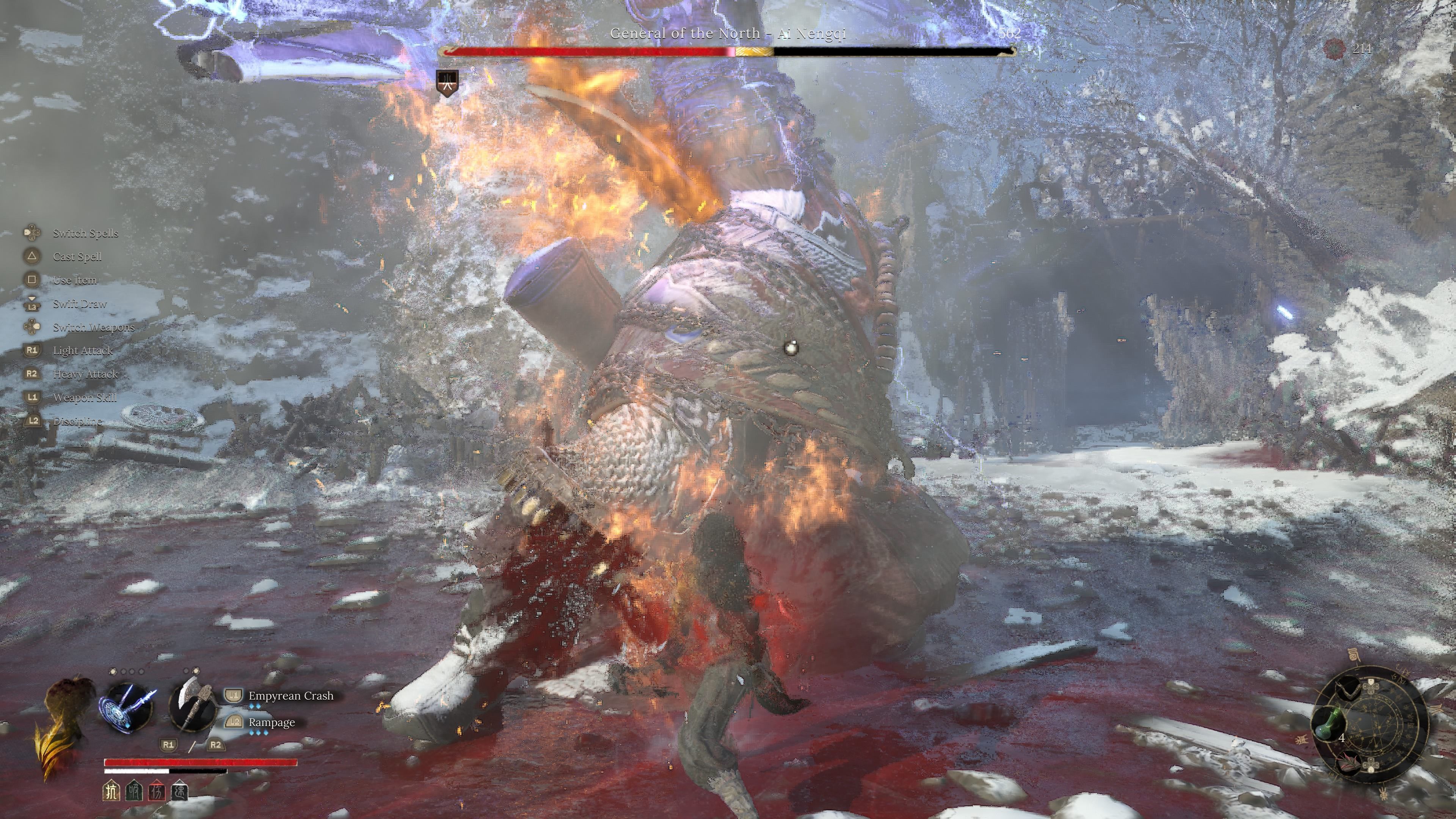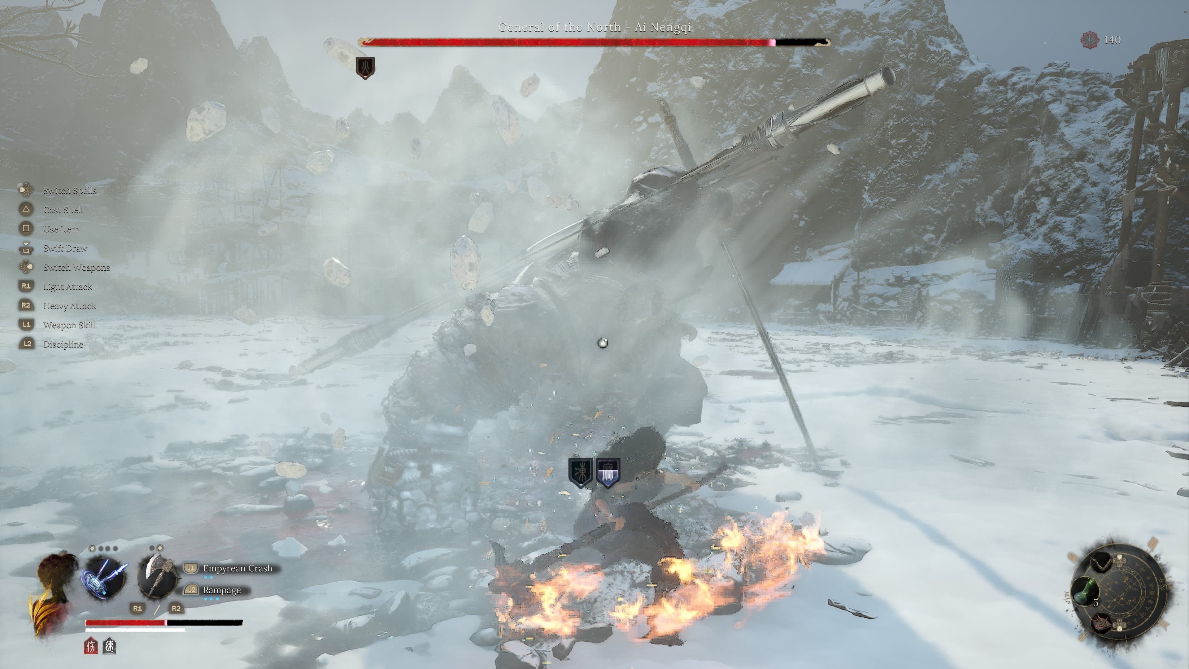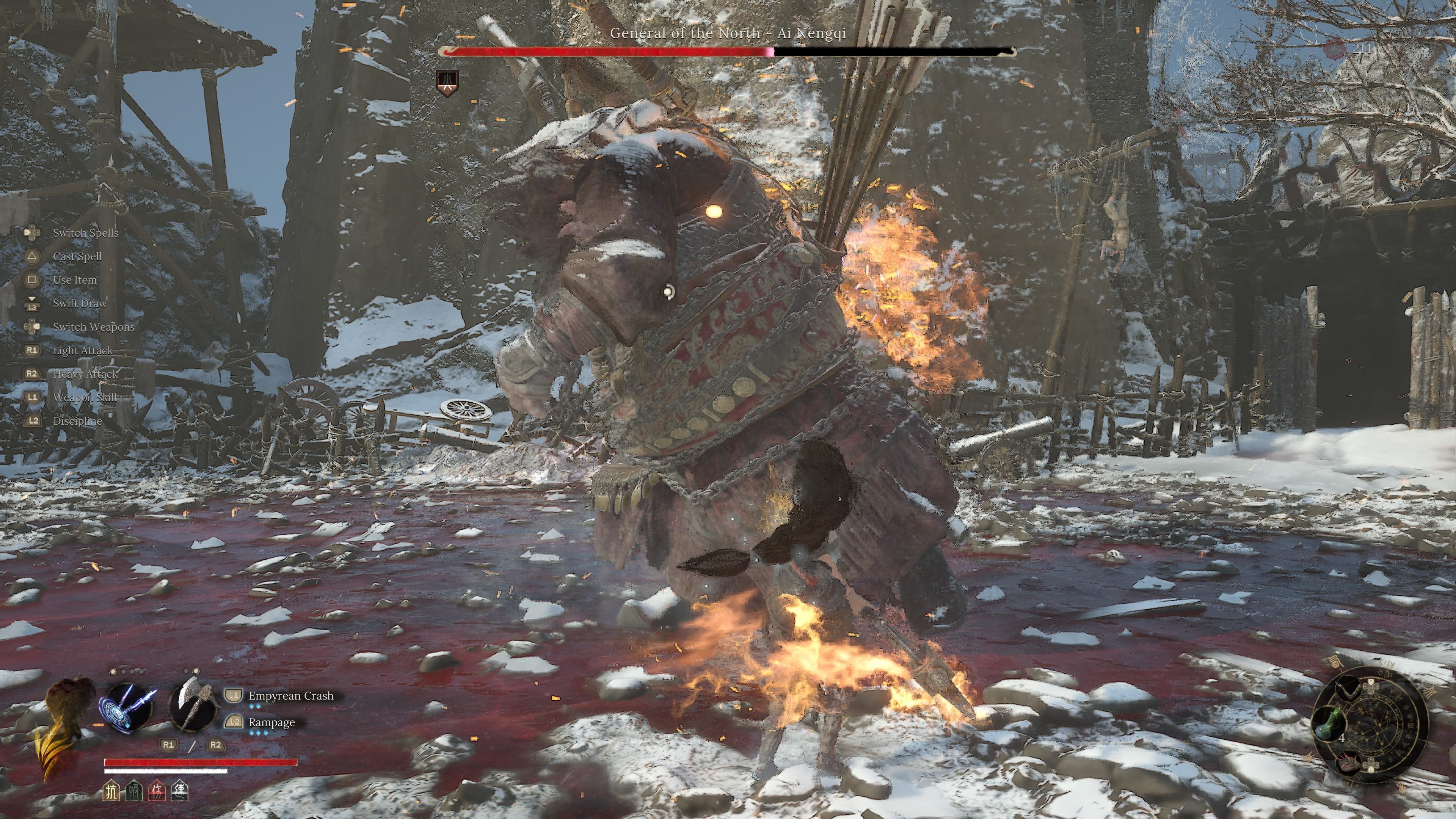 - 7 ognistych wymachów mieczem - General of the North w drugiej fazie zacznie nieco szybciej wymachiwać mieczem. Atak jest bardzo podobny do serii pięciokrotnych wymachów z pierwszej fazy, różni się jedynie tempo oraz to, że każdy atak nakłada status Burn na Wuchang.