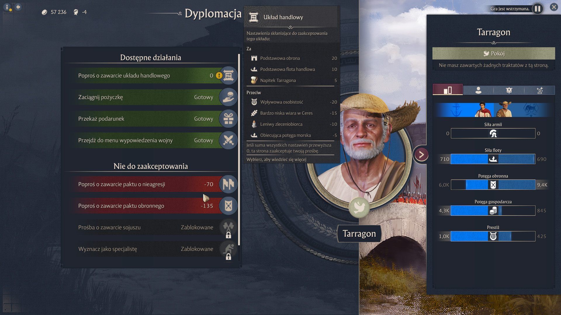 Pierwszy to system dyplomacji. Działa on na bazie bilansu różnych czynników, trochę jak uproszczona wersja tego, co znamy chociażby ze strategii Paradoxu, np. z Crusader Kings III. Gdy proponujemy np. traktat handlowy, przeciwnik komputerowy zestawia ze sobą wszystkie argumenty za i przeciw, sumuje wszystkie wpływy i jeżeli wartość jest dodatnia – zgadza się. Niestety, czynników wpływających na decyzję jest stosunkowo niewiele i cały system wydaje się wyjątkowo grubo ciosany.