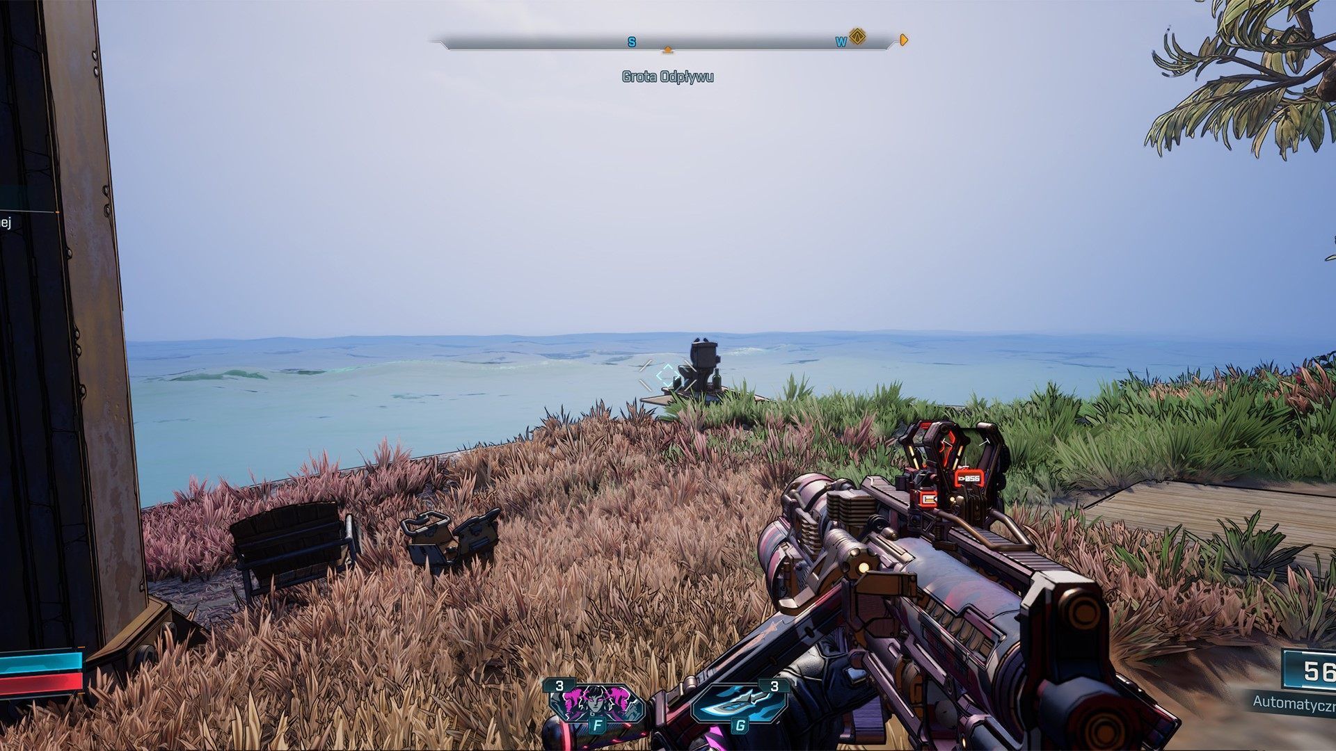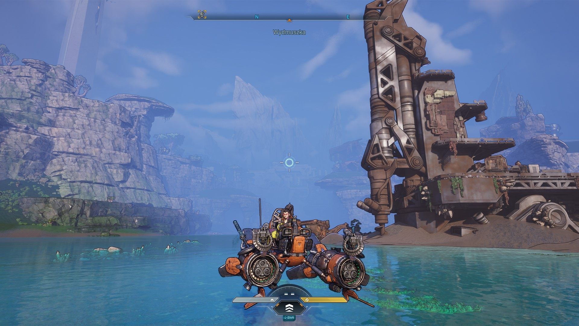 Drugą rzeczą jest dziwna decyzja o pozbyciu się minimapy. U góry mamy kompas, na którym starano się upchnąć najważniejsze aktywności, poza tym mamy też mapę pełnowymiarową. Rozwiązaniem, na które wpadł Gearbox, jest skorzystanie z naszego dronopodobnego przyjaciela – ECHO 4. Robota możemy w każdej chwili przywołać i ten po szybkim skanie okolicy wytyczy ścieżkę do najbliższego punktu. A przynajmniej tak wyglądało to w założeniu, bo mój ECHO 4 (i z tego, co widziałem w sieci – nie tylko mój) miał chyba coś nie tak z zasięgiem. Drogę do celu często pokazywał mi wręcz dookoła, a momentami musiałem się nawet wracać, bo pomylił strony. Ciekawy pomysł, ale rozwiązanie fatalne, bo po prostu niedopracowane. Przemierzanie świata wydaje się na tyle satysfakcjonujące, że pewnie nie korzystałbym z ichniego systemu GPS tak często, jak to robiłem, gdyby nie tak spora liczba „śliskich skał”, które nie pozwalały mi dotrzeć do wybranego miejsca.