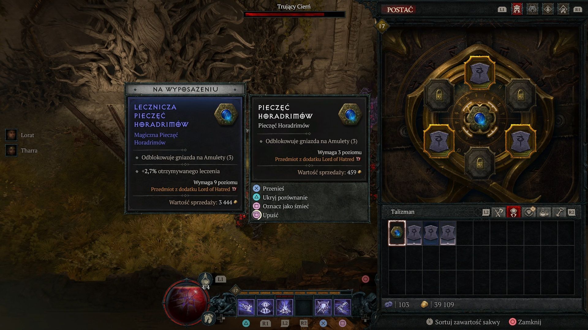 To w swoich założeniach mechanizm wręcz banalnie prosty, ale o dziwo dodaje on wystarczająco dużo głębi do całego procesu budowania i dopieszczania naszego bohatera. A bądźmy ze sobą szczerzy – w grach hack'n'slash ta gonitwa za tym jednym, konkretnym, brakującym elementem idealnego setu to od zawsze całkiem niezłe i wciągające zajęcie. I tutaj to działa akurat bez zarzutu. I zanim dostaniecie zawału na myśl o powrocie do ery Diablo 2, gdzie talizmany zżerały całe miejsce w plecaku – uspokajam. Twórcy poszli po rozum do głowy i zaserwowali nam na to osobną zakładkę w ekwipunku.