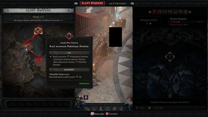 W specjalnym oknie wybieramy sobie zestaw aktywności, które chcemy wykonać podczas danej próby. Różnią się one między sobą typem wyzwań czy oferowanymi nagrodami, a jeśli zrealizujemy wszystkie z naszej listy, zgarniamy solidne bonusy za ukończenie całości. Żeby tego było mało, każdą z tych aktywności możemy dodatkowo rozbudować o kolejne modyfikatory czy extra nagrody – przypomina to trochę taki uproszczony system Atlasu z Path of Exile. Jako gracz, który ponad wszystko ceni sobie różnorodność i po prostu nienawidzi farmić w kółko jednej i tej samej rzeczy, powiem, że to jest bardzo sensowne rozwiązanie. Plany Wojenne idealnie sprawdzają się do farmienia oraz wzmacniania buildu w przerwach między robieniem kolejnych poziomów Dołów czy jakichkolwiek innych aktywności. Choć trzeba pamiętać, że to wciąż Diablo – drzewka rozwoju konkretnych aktywności wnoszą trochę świeżości, ale nie są zbyt duże. Najlepsi gracze szybko dostrzegą, które opcje będą najbardziej opłacalne.