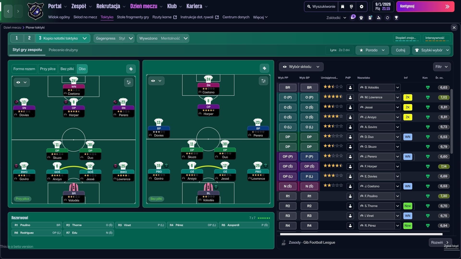 Na plus należy zdecydowanie zaliczyć wprowadzenie nowych opcji taktycznych. Twórcy Football Managera 26 przywrócili możliwość ustawienia zespołu w obronie oraz ataku osobno, co przypomina rozwiązania znane już z legendarnego Championship Managera 01/02. Dla weterana takiego jak ja to prawdziwy prezent – wreszcie mogę precyzyjnie zaplanować role zawodników w dwóch fazach meczu: w posiadaniu piłki i bez piłki.