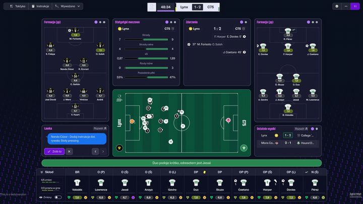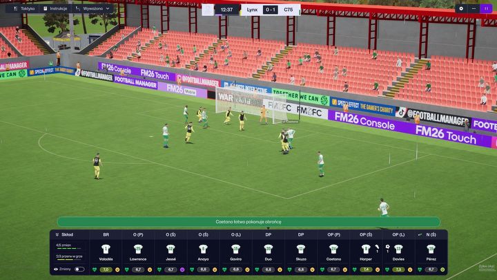 Nie ma się jednak co oszukiwać. FM26 nie dorównuje graficznie typowym grom piłkarskim, takim jak EA FC. Ale nie o to przecież chodzi. W dalszym ciągu uważam, że nowy silnik meczowy to ogromne ulepszenie względem poprzedniej wersji. Powoli czuję, że oglądam prawdziwy mecz piłki nożnej, a nie tylko abstrakcyjną reprezentację statystyk. Dzięki nowemu trybowi Broadcast Mode i kinowym kamerom oprawa meczowa zyskała wymiar, którego dotychczas brakowało. Nazwijcie mnie nawróconym, ale zakochałem się w widoku 3D w FM26.