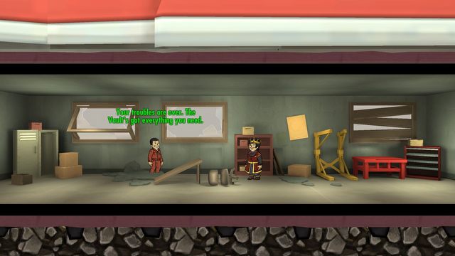 Fallout Shelter powstało jako gra mobilna i to czuć. Z jednej strony to lekka i miła produkcja, która nie odstraszy nikogo ani poziomem trudności, ani przesadnie wysokimi wymagania sprzętowymi. Niestety, są też cechy, które na pecetach sprawdzają się dość przeciętnie. Zacznijmy od początku – rozwijanie schronu przez pierwszych parę godzin nie jest porywające. Na urządzeniu mobilnych po prostu zaglądamy co jakiś czas do krypty, tapujemy w pomieszczenia, stawiamy nowe i wychodzimy. Sposób grania w stylu: wejdź, poklikaj i zamknij aplikację nie sprawdza się tak dobrze na PC, gdzie oczekujemy od gry wzbudzenia w graczach większego zaangażowania. A w Shelter na początku często po prostu nie mamy co robić: czekamy na wyprodukowanie zasobów lub dotarcie wysłanych na powierzchnię mieszkańców do celu, a to potrafi trwać całymi godzinami. Ten nudnawy prolog na szczęście z czasem się rozkręca. Im więcej mamy mieszkańców, tym więcej wypraw na powierzchnię możemy przedsięwziąć, a i zwykłe zarządzenie schronem trwa coraz dłużej. To nie jest gra dla niecierpliwych, bo błyszczeć zaczyna dopiero po kilku, a nawet kilkunastu godzinach. Dobrze chociaż, że te możemy spędzić częściowo robiąc coś innego, aplikację po prostu minimalizując i zaglądając do niej tylko od czasu do czasu.