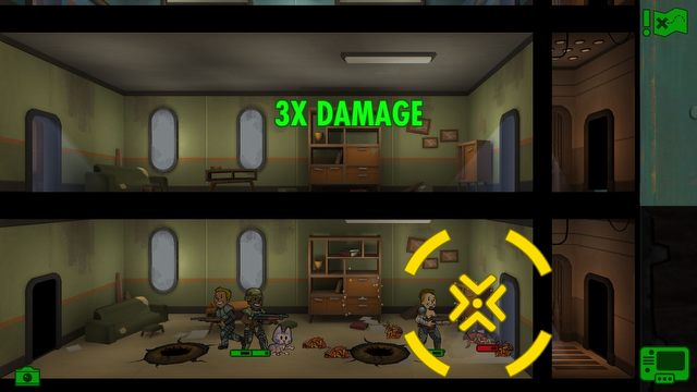 Do tej pory w Fallout Shelter nie opuszczaliśmy schronu. Owszem, wysyłaliśmy mieszkańców na misje, z których przynosili bronie czy przedmioty do craftingu, ale sprowadzało się to do ramki tekstowej, opisującej – całkiem zabawnie – perypetie postapokaliptycznego poszukiwacza. Aktualizacja 1.6 wprowadza rewolucję, bo za pomocą nowego pomieszczenia nadzorcy (Overseer's Office) bierzemy udział w misjach specjalnych. Wysyłamy na nie teraz do trzech postaci, a w ciągu drogi (często wielogodzinnej) nic się nie dzieje. Dopiero na miejscu trafimy na schron czy budynek, który musimy, pokój po pokoju, eksplorować w poszukiwaniu wyznaczonego celu (np. bandyty do zabicia czy postaci do uratowania). Całość okraszono bardziej angażującym systemem walki, który działa jednak tylko w czasie misji – w schronie mieszkańcy dalej walczą z przeciwnościami na własną rękę. W czasie zwiedzania kolejnych pomieszczeń likwidujemy oponentów, a możemy nie tylko kierować ogień towarzyszy na wskazanych wrogów, ale także wykonywać czasami ataki specjalne: po zaliczeniu minigierki zadajemy po prostu dodatkowe obrażenia (nawet do pięciu razy większe nic normalnie).