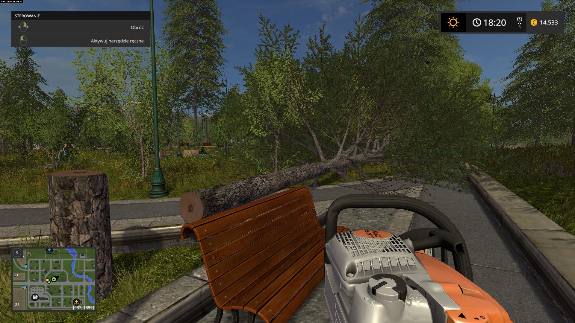 Nowością w poprzedniej odsłonie serii było prowadzenie wycinki drzew. Wiele osób podeszło jednak do niej ze sporą dozą rezerwy, głównie z powodu dość słabej mechaniki owych prac. Niestety, w FS 17 nic się w tej kwestii nie zmieniło. Ścięte drzewa padają (lub nie) według jakichś przedziwnych praw fizycznych. Kompletnie nie istnieją też jakiekolwiek pozwolenia na wycinkę. Możemy wykarczować praktycznie dowolny obszar, nawet miejski park (co też ochoczo uczyniłem, nie doczekawszy się żadnej kary).