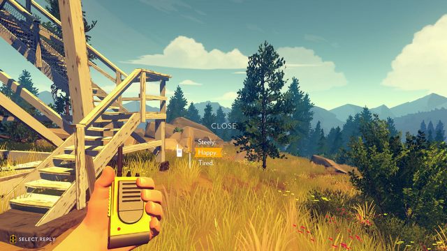 Zanim Firewatch pozwoli nam odpowiedzieć na to pytanie, najpierw musimy przekonać się, z czym w produkcie studia Campo Santo mamy właściwie do czynienia. Początek zmagań jest bardzo nietypowy, bo serwuje nam skojarzenia z tekstowymi grami sprzed dekad. Na kolorowym tle wyświetlają się opisy rzeczy, które widzi nasz bohater, a my wybieramy reakcję, która wydaje się najlepiej pasować do przedstawionej sytuacji. Ten literacki zabieg naświetla niełatwe życie Henry’ego, zanim objął posadę leśniczego, i w doskonały sposób wyjaśnia, dlaczego nasz bohater znalazł się właśnie w tym miejscu i w tym czasie. Napisy przeplatają się z krótkimi, interaktywnymi scenkami na silniku gry, dzięki czemu pierwsze wrażenie okazuje się niezwykle pozytywne. W tak nakreślony świat po prostu chce się wejść!