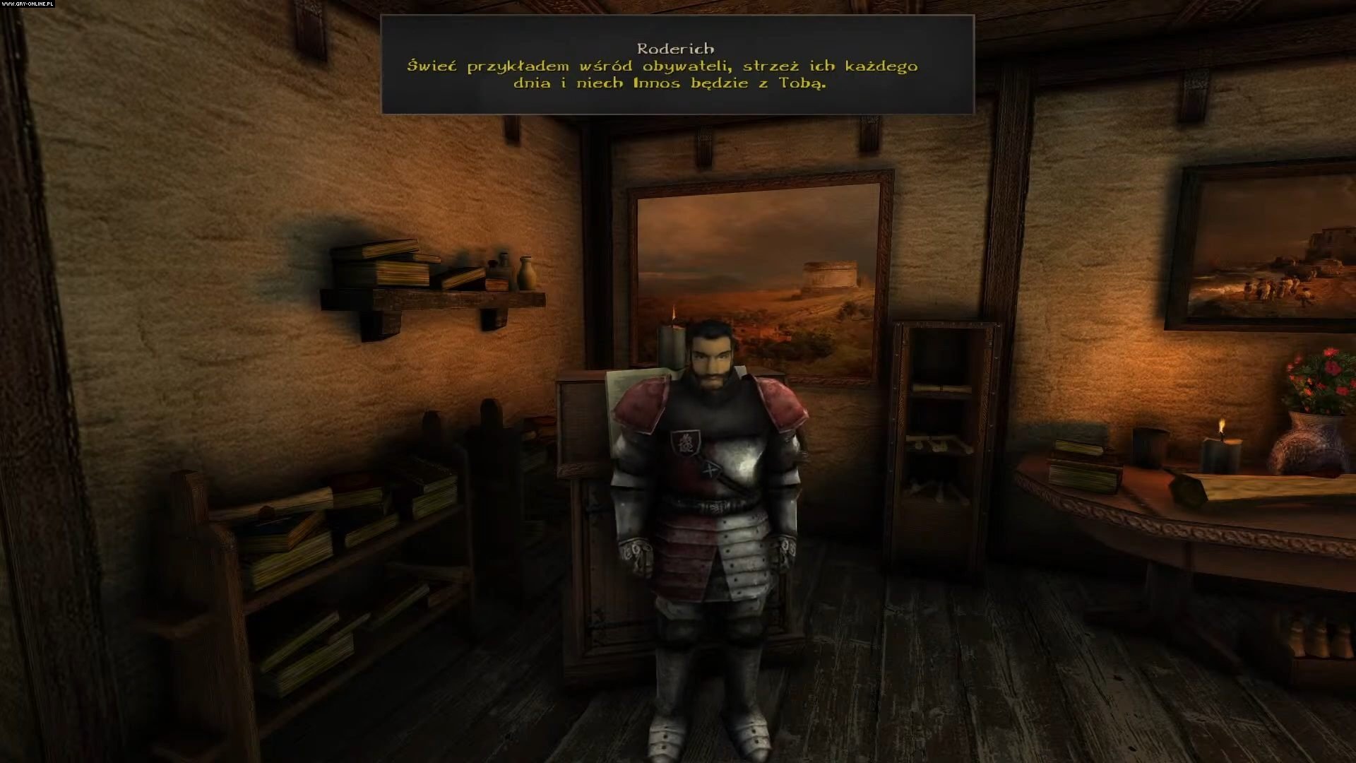 Myślicie, że narzekam? A skąd! Pierwsze dwie odsłony serii Gothic uwielbiam zaczynać – drugie rozdziały wiążą się zaś zwykle z uczestnictwem w bardziej doniosłych wydarzeniach (atak na gniazdo pełzaczy, powrót do kolonii karnej), przez które zwykłe problemy szarych obywateli (tudzież więźniów) schodzą na dalszy plan. W Kronikach Myrtany tego typu proste zadania otrzymujemy w zasadzie przez cały czas. Również dołączanie do jednego z dwóch stronnictw – w moim przypadku Straży Miejskiej – wiąże się z wieloma prozaicznymi questami. Trzeba wziąć udział w szkoleniu, iść na patrol czy zdobyć broń, a przedtem pomóc mieszkańcom Archolos w ich sprawach, aby zdobyć listy polecające, stanowiące przepustkę do zostania obywatelem miasta. Sporo roboty i dużo biegania – dzięki Adanosowi, że różne rodzaje szybkiej podróży są dostępne niemal od początku – ale w to mi graj.