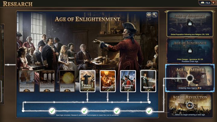 Drogę do zwycięstwa rozpoczynamy od czegoś, co znane jest każdemu fanowi tego typu gier – „drzewka” technologii. Działa to nawet w prostszy sposób niż w Cywilizacji, ponieważ nie mamy do czynienia z faktycznym drzewkiem, tylko z blokami podzielonymi na ery. Po opracowaniu wymaganej liczby technologii możemy przejść do kolejnego i właściwie do końca gry nie musimy dokonywać wszystkich odkryć. Oprócz tego zbieramy punkty kultury, które po osiągnięciu określonego progu umożliwiają wykonanie rozmaitych akcji, na przykład przyspieszenie rozwoju technologicznego czy przeprowadzenie reformy rządu.