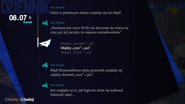 Na sam koniec zostawiłem coś, co niewątpliwie zainteresuje rodzimych graczy – Persona 3 Reload otrzymała polską lokalizację kinową. Biorąc pod uwagę ogrom tej produkcji oraz ilość zawartego w niej tekstu, jest to rzecz istotna i niezmiernie się cieszę, że gra została przełożona na nasz język. Chciałbym tylko, aby dokończono to przed premierą. Nie zrozumcie mnie źle, polskie tłumaczenie jest w porządku, często puszcza do nas oczko, wspominając przykładowo o Panu Tadeuszu – zawiera jednak bardzo dużo pomniejszych baboli, przez które momentami łapałem się za głowę. Zdarzają się literówki i okazjonalne błędne nazwy (np. umiejętność Agi, czyli podstawowy atak ognisty, została na karcie jakimś cudem przetłumaczona jako... zwinność), większy problem stanowi jednak formatowanie tekstu. Opisy niektórych aktywności są za długie i nie mieszczą się w ramce, gra zmniejsza więc czcionkę – co skutkuje kompletnie nieczytelnym opisem. Żaden z tych błędów nie jest wprawdzie na tyle poważny, by uniemożliwić rozgrywkę, niemniej kłują one w oczy. Choć poziom lokalizacji nie miał ostatecznie wpływu na moją końcową ocenę, uznałem, że należy o tym wspomnieć.