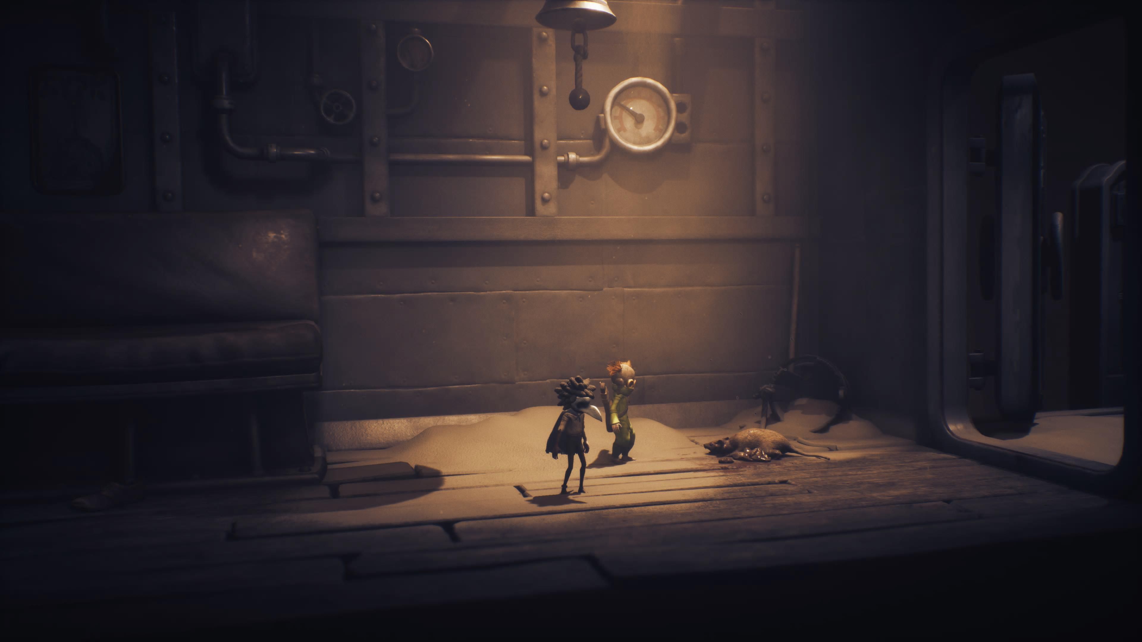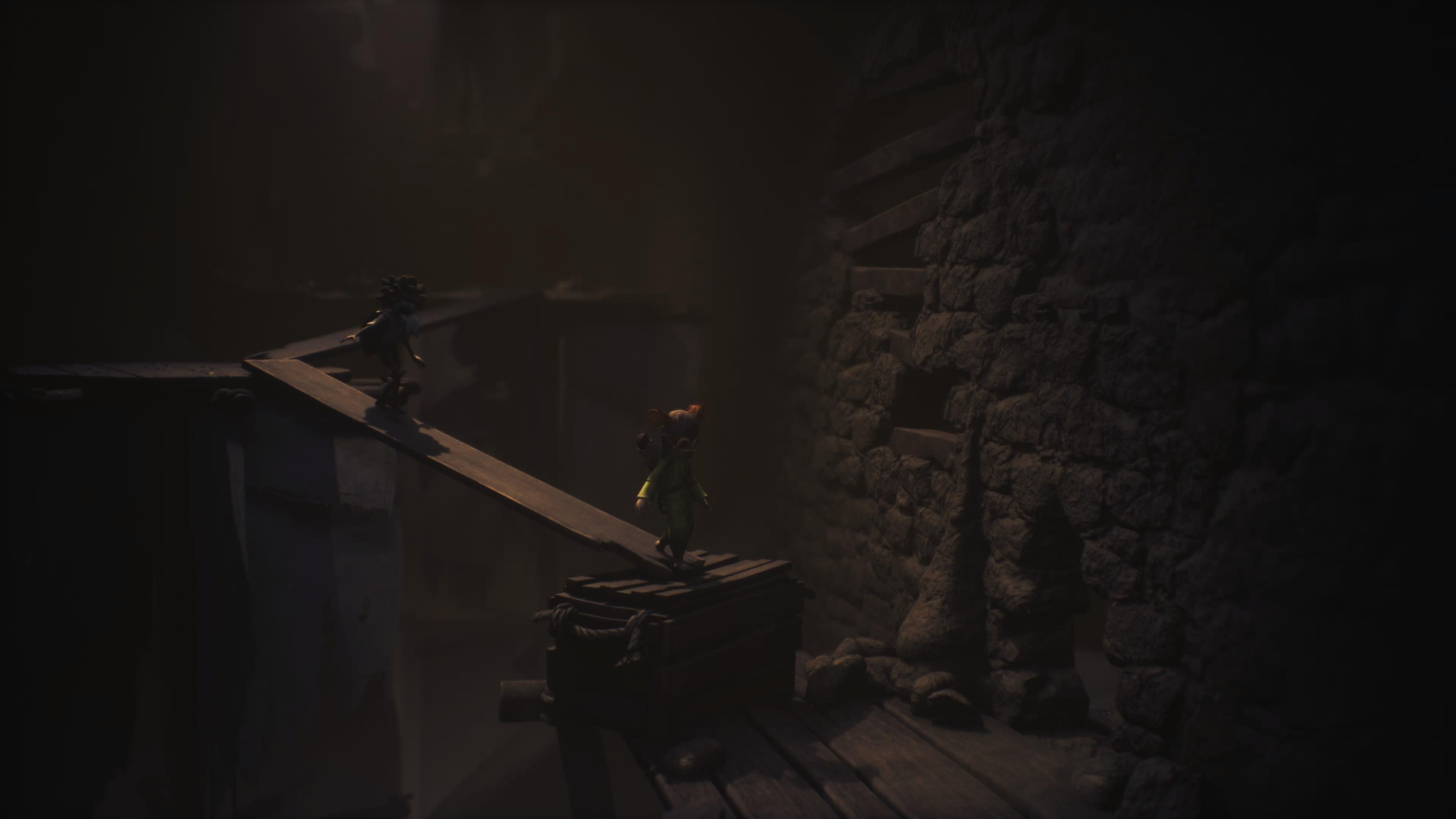 Gorzej sprawa ma się z animacjami postaci. O ile podczas zwyczajnego poruszania się Row i Alone zachowują się całkiem naturalnie, to przy skakaniu zbyt często dzieją się cuda. System detekcji kolizji z obiektami o wiele za często wariuje, efektem czego postacie na chwilę zawieszają się w powietrzu w skokowej animacji – dawno nie widziałem gry od dużego wydawcy, która byłaby w tej kwestii aż tak bardzo niedopracowana. Średnio wypada też kwestia interaktywności otoczenia – z jakiegoś powodu na bardzo wiele stołów, krzeseł czy półek nie możemy się wspiąć, a jedynie na nich zawisnąć, a interaktywnych obiektów walających się po otoczeniu jest zauważalnie mniej niż w poprzedniczkach. Pierwsze i drugie Little Nightmares były w kwestii dopracowania takich małych detali o wiele lepsze.