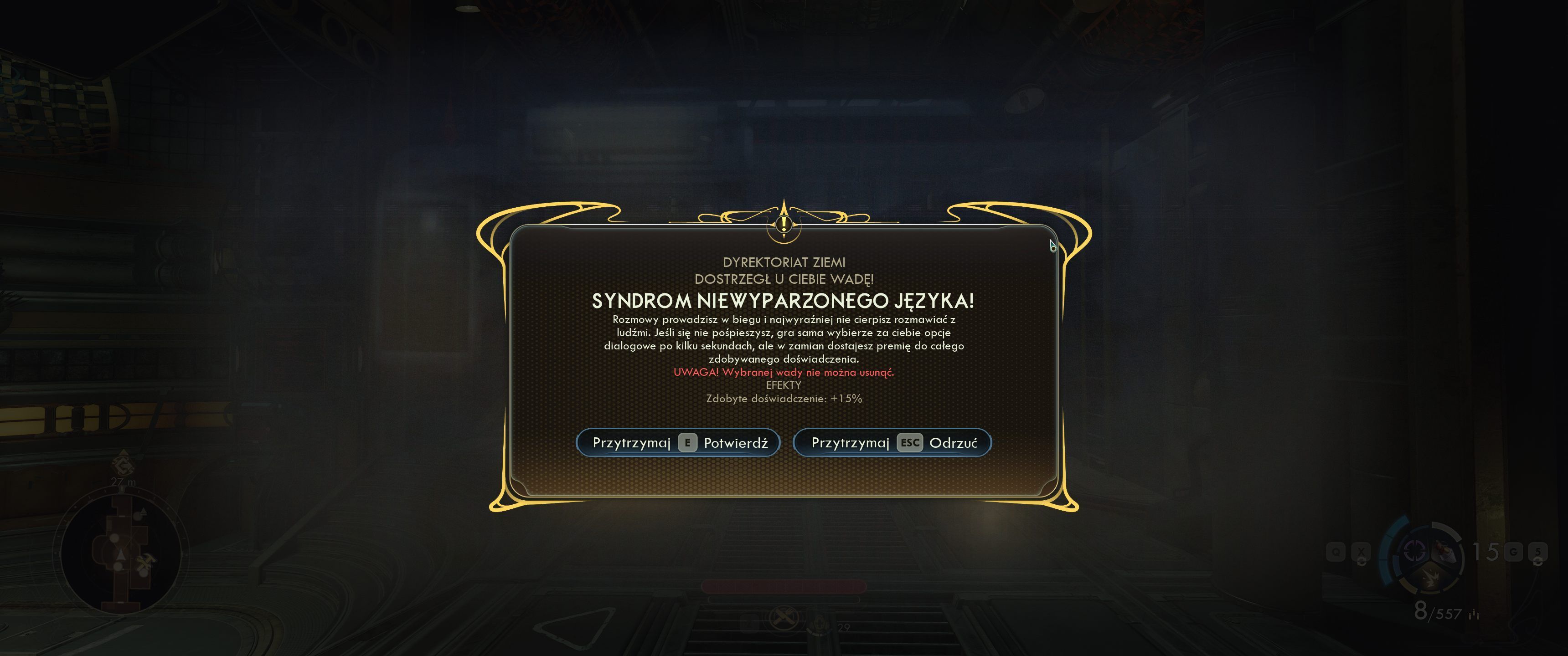Do The Outer Worlds 2 powraca również unikatowy dla serii system wad. Był on jednym z najlepszych elementów jedynki i jest takowym też i tutaj. Wady to dodatkowe perki, które gra oferuje nam po spełnieniu ukrytych wymagań. Ich przyjęcie jest opcjonalne, przyjętych wad nie da się usunąć i mają one poważne negatywne efekty, lecz zawsze oferują również poważny efekt pozytywny. Każda pojawiająca się wada stanowi ciekawą decyzję, którą trzeba poważnie przemyśleć, a niektóre z nich drastycznie zmieniają doświadczenia z rozgrywki, czyniąc z nas straszliwego pechowca lub zmuszając do szybkiego wybierania kwestii dialogowych. Jak wspomniałem wyżej, wady ponadto wpływają także na konwersacje, odblokowując nowe dialogi i poszerzając możliwości roleplayowe.