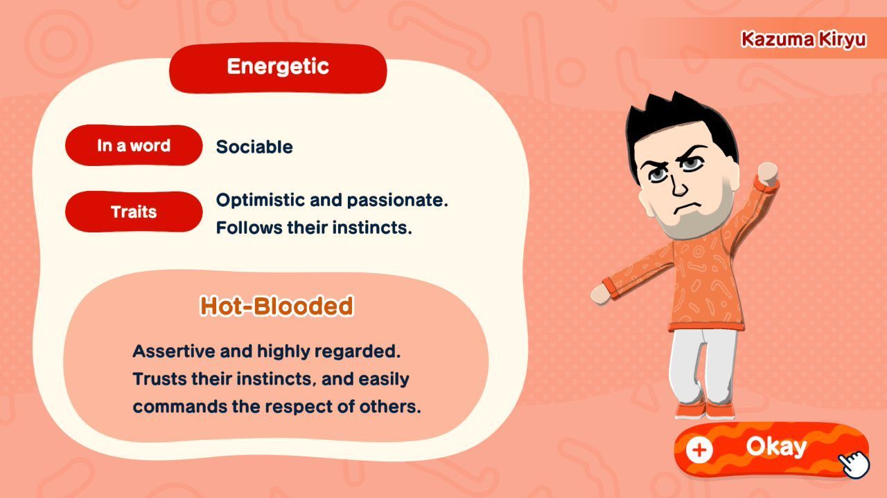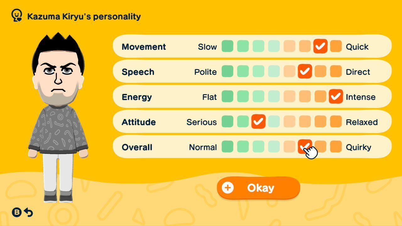 Po stworzeniu wyglądu Mii należy też doprecyzować jego pozostałe cechy. Imię i nazwisko połączono w jedno pole, choć mogłoby ono być nieco dłuższe – ze względu na limit znaków, Stanisław Wokulski na mojej wyspie musiał stać się Stachem Wokulskim. W oddzielnym polu możemy także doprecyzować wymowę imienia, wpisując ją fonetycznie. Program nie zawsze działa tu idealnie i ma problemy z niektórymi nazwiskami (najbardziej problematycznymi podczas moich testów byli Herlock Sholmes i Sam Vimes), choć dostatecznie uparty gracz prędzej czy później zmusi go do załapania poprawnej wymowy. W porównaniu do poprzedniczki, bardzo rozwinięto tu kwestię płci i orientacji – w oddzielnych menu wybieramy płeć Mii (mężczyzna, kobieta, osoba niebinarna), preferowane zaimki, preferowane rodzaje ubioru uroczystego oraz w Mii której płci może się zakochać (w jednej, dwóch, wszystkich lub w żadnej). Jest to funkcjonalność, którą Nintendo zapowiadało już od dawna, i z obietnicy istotnie się wywiązali. Głos postaci ustawiamy przy pomocy czterech różnych wpływających na niego osi, zaś system osobowości pozostał całkowicie niezmieniony od czasu oryginału – składa się z pięciu różnych osi, po których wypełnieniu gra przydziela naszemu Mii najbardziej pasujący z szesnastu dostępnych typów osobowości. Warto tu wspomnieć, że nasze wybory w kreatorze nie są permanentne i możemy za darmo zmienić dowolny aspekt dowolnego Mii w dowolnym momencie, wchodząc w jego profil. Całokształt kreatora postaci jest bardzo zadowalający, a jego obsługa sprawia czystą przyjemność.
