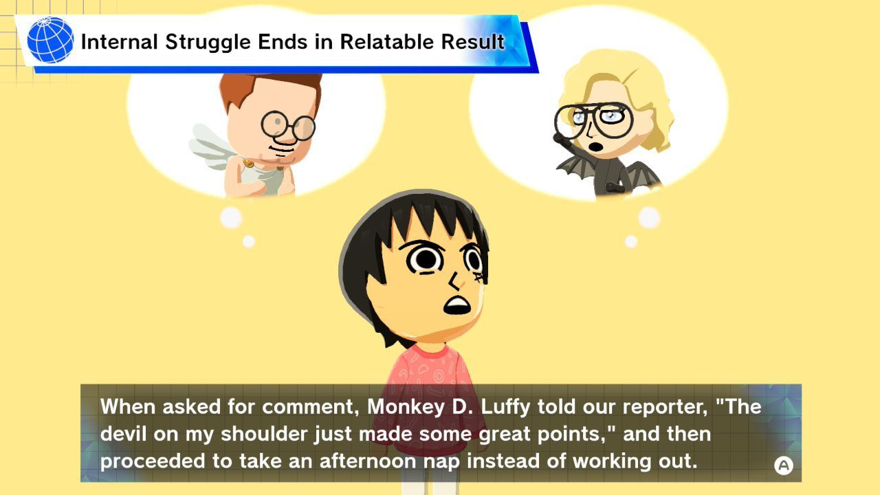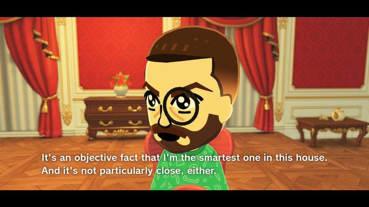 To właśnie było źródło popularności Tomodachi Life, a dzięki wprowadzonym usprawnieniom pokroju możliwości zmuszania konkretnych Mii do spotykania się nawzajem, sequel zachowuje dokładnie ten sam memiczny potencjał. Trudno określić, czy humor zawsze jest zamierzony – rozmowa z Hornet tuż po wyżej wspomnianym rozwodzie skutkowała długim i zaskakująco przygnębiającym montażem retrospekcji, ukazującym powolny rozpad jej małżeństwa i kończącym się długim kadrem Hornet, samotnej w pustym, ciemnym domu. Ta nagła i drastyczna zmiana tonu w porównaniu z resztą gry była zarówno szczerze smutna jak i przezabawna. Względem spełniania takowych scenariuszy Tomodachi Life: Living the Dream nie ma sobie równych, i tylko wasza kreatywność ogranicza was podczas tworzenia najbardziej niedorzecznych zbiorów Mii.
