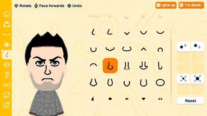 Nie jest to jednak kreator idealny i zabrakło w nim kilku funkcji. Brak możliwości ustawienia heterochromii utrudnił odtworzenie Melinoe z Hadesa 2, zaś stosunkowo mały wybór typów zarostu oznaczała, że mój Harry z Disco Elysium musiał obyć się bez swoich ikonicznych bokobrodów (aczkolwiek jego pijacki uśmiech i cerę udało się odtworzyć bardzo wiernie). Niektóre braki można natomiast nadrobić zaskakująco rozwiniętą opcją malowania twarzy, oferującą różne rodzaje pędzli, wiele kolorów, stempli i kształtów. Gra daje także możliwość uproszczonego tworzenia Mii poprzez wybieranie komponentów spośród kilku proponowanych przez grę, lecz opcja ta wydaje się dodana kompletnie na doczepkę – trudno było stworzyć z jej pomocą jakkolwiek porządnie wyglądającego Mii, a sam proces jest w praktyce mocno okrojony, nie będąc ani znacząco łatwiejszym, ani krótszym od skorzystania z pełnego kreatora.