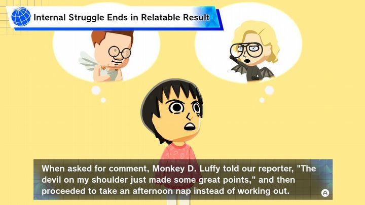 Tutaj we znaki wdaje się ten sam problem, na który niestety cierpiało oryginalne Tomodachi Life – gra jest dość powtarzalna. Dostępnych problemów, snów, wydarzeń i minigier jest za mało i szybko zaczynają stawać się mocno rutynowe – nie zliczę ile razy widziałem sen ze skokiem na bungee, który zawsze wyglądał dokładnie tak samo. Po rozwiązaniu wszystkich obecnie istniejących problemów pozostaje nam więc ponownie wziąć się za proces twórczy, zmuszać Mii do interakcji lub rozdawać im prezenty. Skutkuje to grą, która najlepiej sprawdza się przy krótkich, codziennych sesjach, do czego zachęcają również codziennie zmieniające się oferty w sklepach na naszej wyspie.