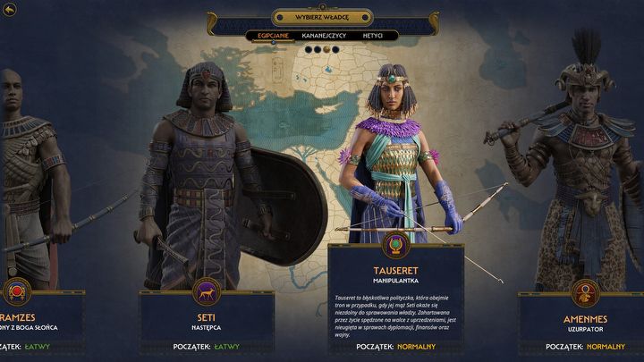 Czy to się udało? I tak, i nie. Grę zaczynamy tuż przed „upadkiem” i możemy wybierać spomiędzy kilku reprezentantów cywilizacji Egiptu, Hetytów i Kananejczyków. Każdy z nich ma nieco inny charakter, a tym samym umiejętności i specjalne cechy, z których wynikają rozmaite bonusy. Tradycyjnie dla tej serii część „frakcji” ma na początku bardziej pod górkę od innych. Ostatecznie jednak przedstawiciel każdej z nich musi się natrudzić, bo po zaledwie kilkunastu turach na spokojnych dotąd morzach zaczynają grasować wygłodniali najeźdźcy.