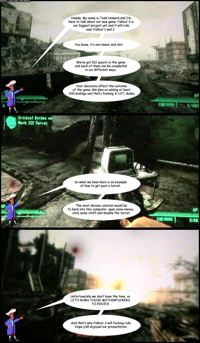 Starzy wyjadacze Fallouta mają pretensje do tówrców, bo mało jest turówek, a tak rozbudowanych jak Fallout nie ma. Jednak wcale nie przekraśla to wydania innych gier z tej serii w postaci turówek, widać tu tylko ślepe podejście "w00t, nie ma tur, OMG jusz jest do kitu!!1". Kto nie lubi strzelanek, jego problem, niech ominie ten tytuł. A gdyby z Diablo III zrobili turówkę? Z pokemonów wyścigi? Jednym by się spodobało, drugim nie...