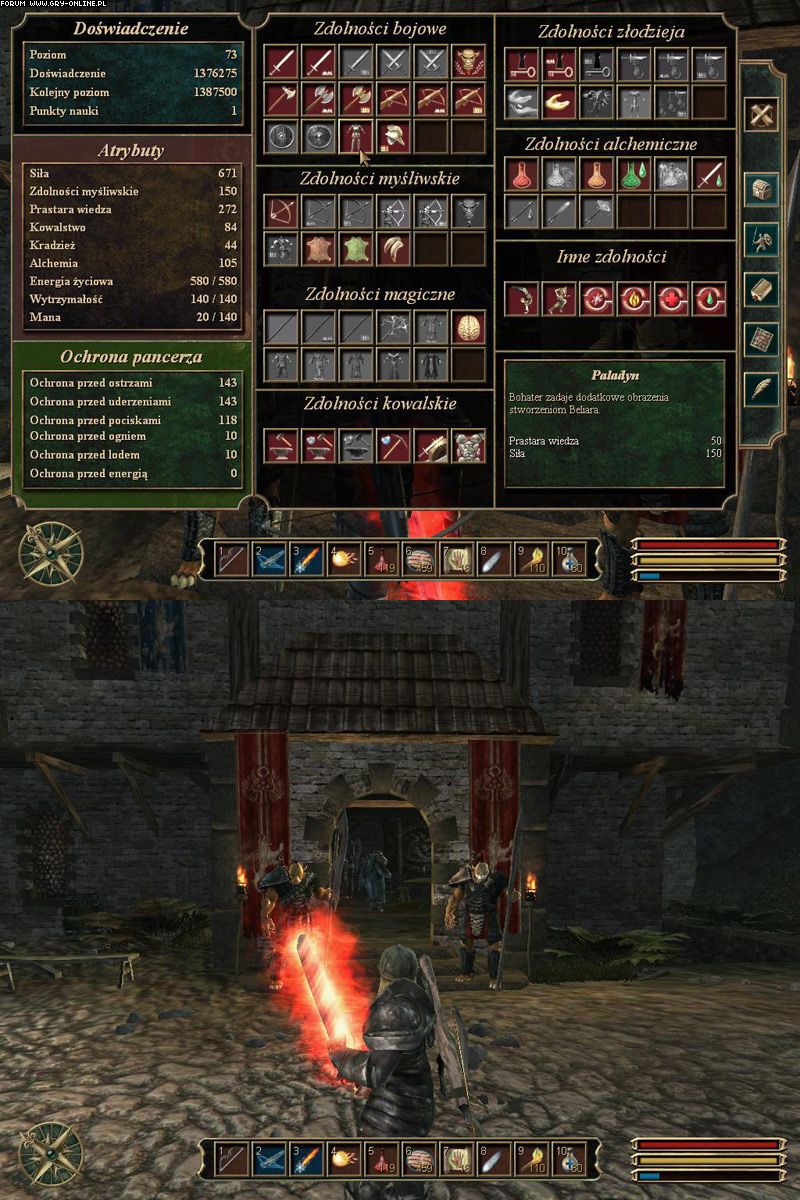Karta postaci i rozwój jest w porządku. To po prostu usprawniona wersja tego co mieliśmy w poprzednich Gothicach. Doszło kilka nowych umiejętności, zmieniła się magia. Trochę nie pasowało mi jednak dodanie kilku nowych atrybutów. Zręczność niepotrzebnie rozbito na zdolności myśliwskie i złodziejskie. Doszły jeszcze zdolności kowalskie, też bez potrzeby. Przez to na te atrybuty trzeba zmarnować sporo PN.