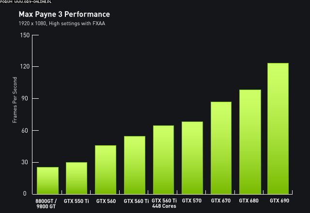 Wykres szybkości kart graficznych w Max Payne 3 w rozdzielczości 1920x1080, ustawienia: Wysokie z FXAA
