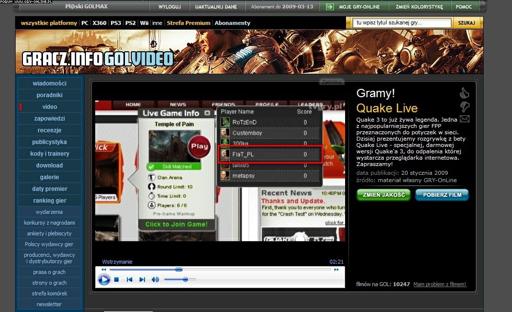 Quake 3 to już żywa legenda. Jedna z najpopularniejszych gier FPP przeznaczonych do potyczek w sieci. Dzisiaj prezentujemy rozgrywkę z bety Quake Live - specjalnej, darmowej wersji Quake'a 3, do odpalenia której wystarcza przeglądarka internetowa. Zapraszamy! (297)